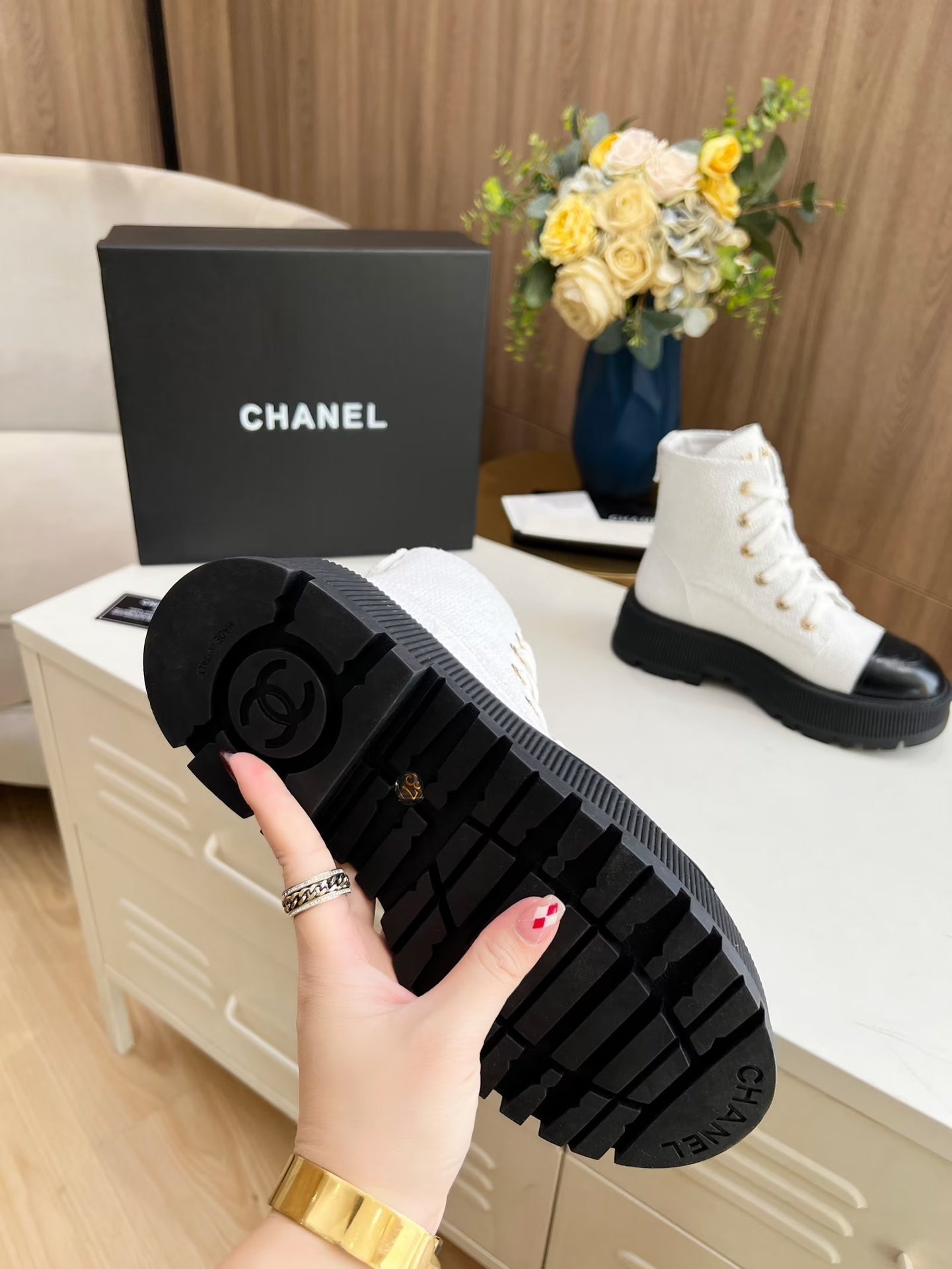 SHORT BOOTS IN WHITE TWEED AND BLACK CALFSKIN