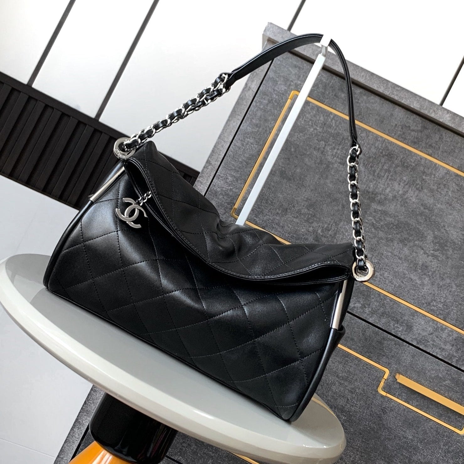 SHOULDER BAG 30 IN BLACK SOFT LAMBSKIN EMBOSSED LOGO SILVER HARDWARE