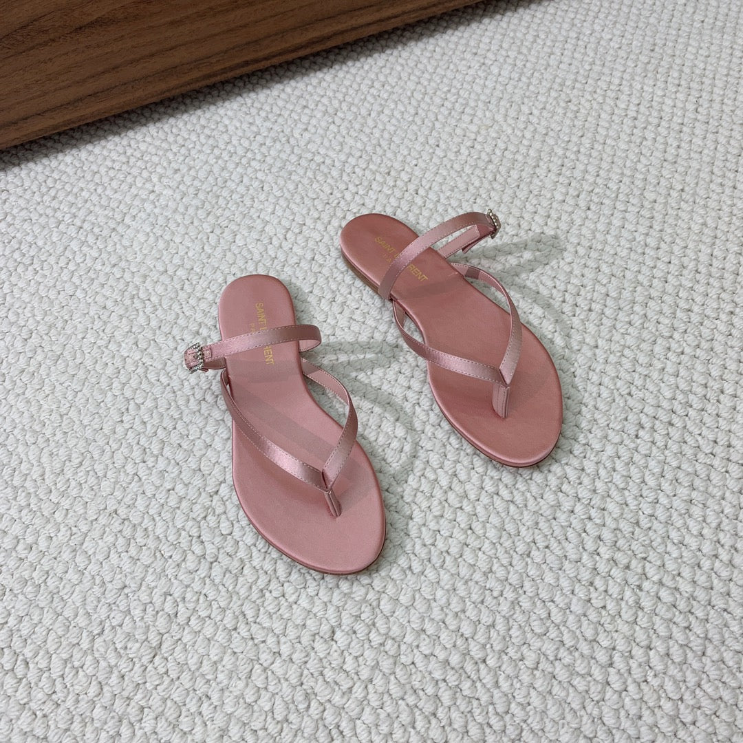 SL CRYSTAL BUCKLE THONG SANDAL LIGHT PINK SATIN