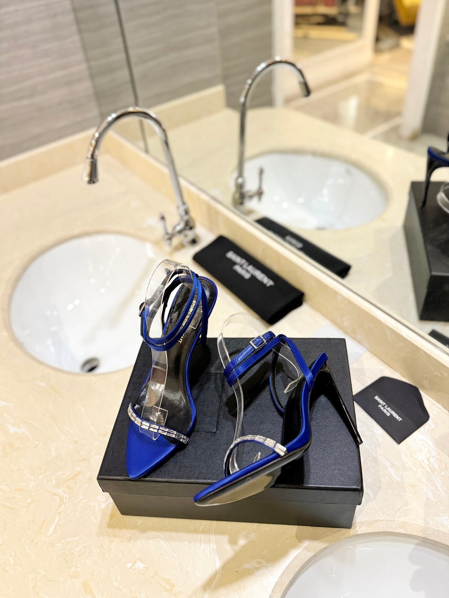 SL RHINESTONE HEELED SANDALS COBALT SATIN