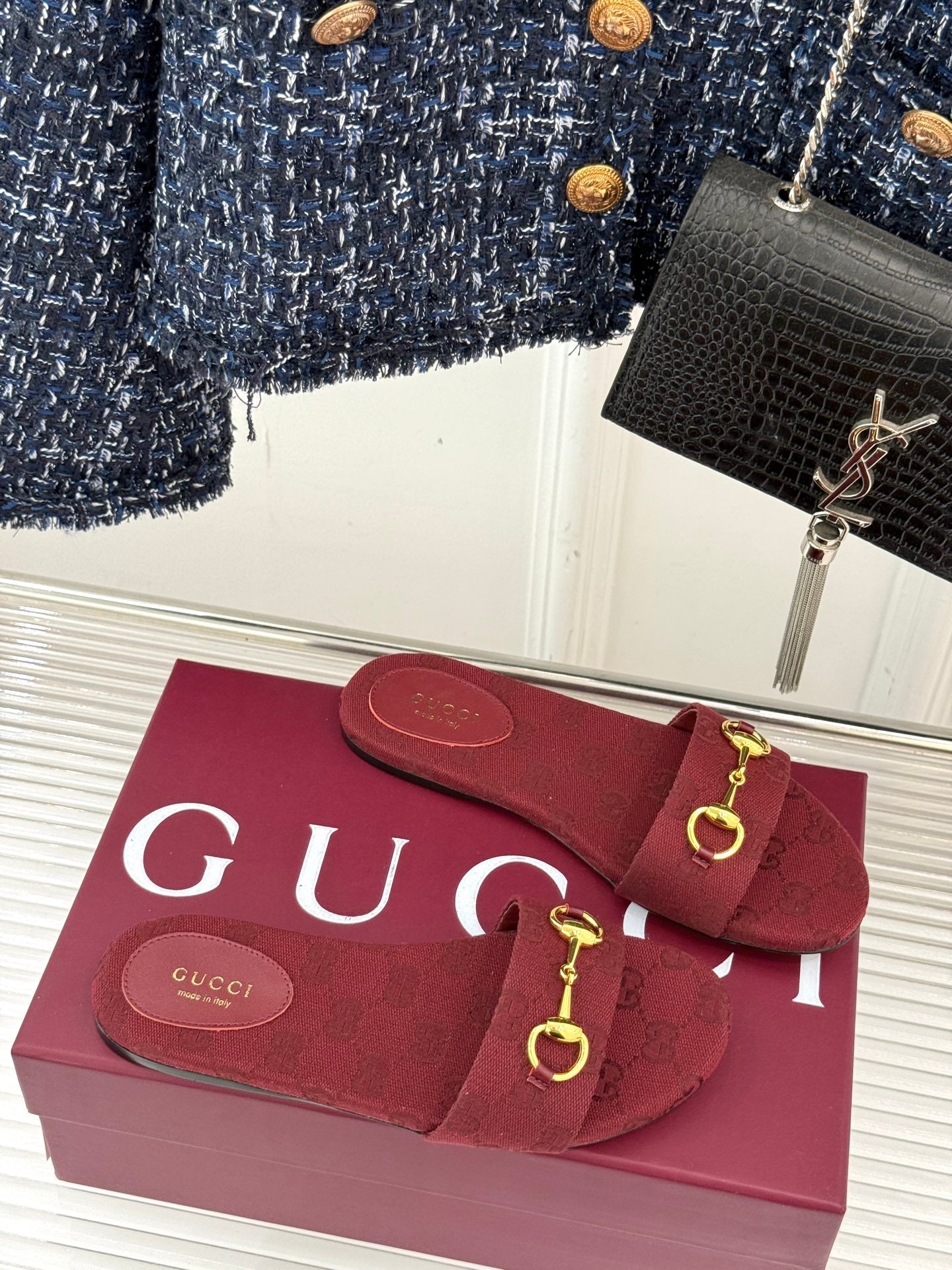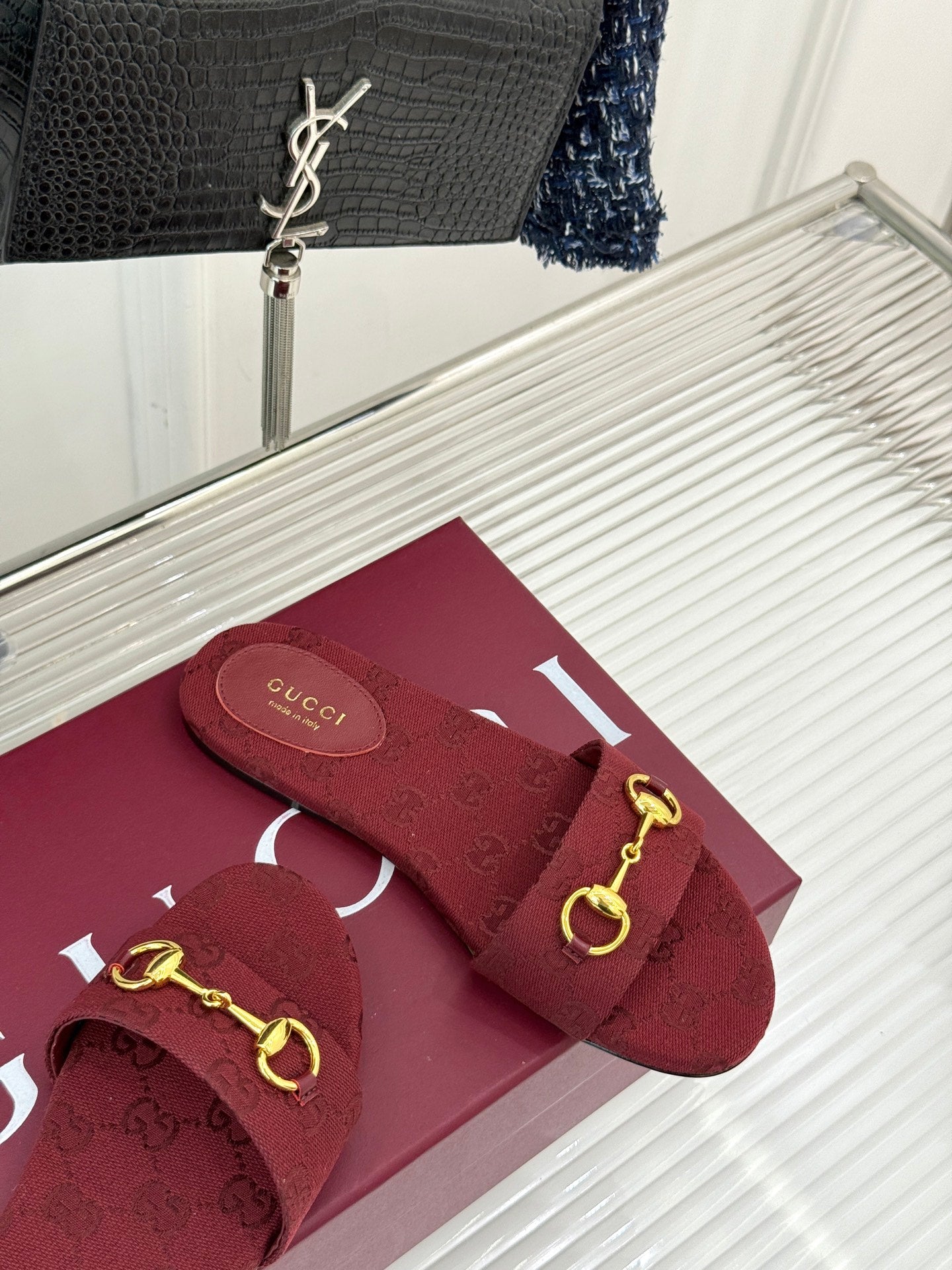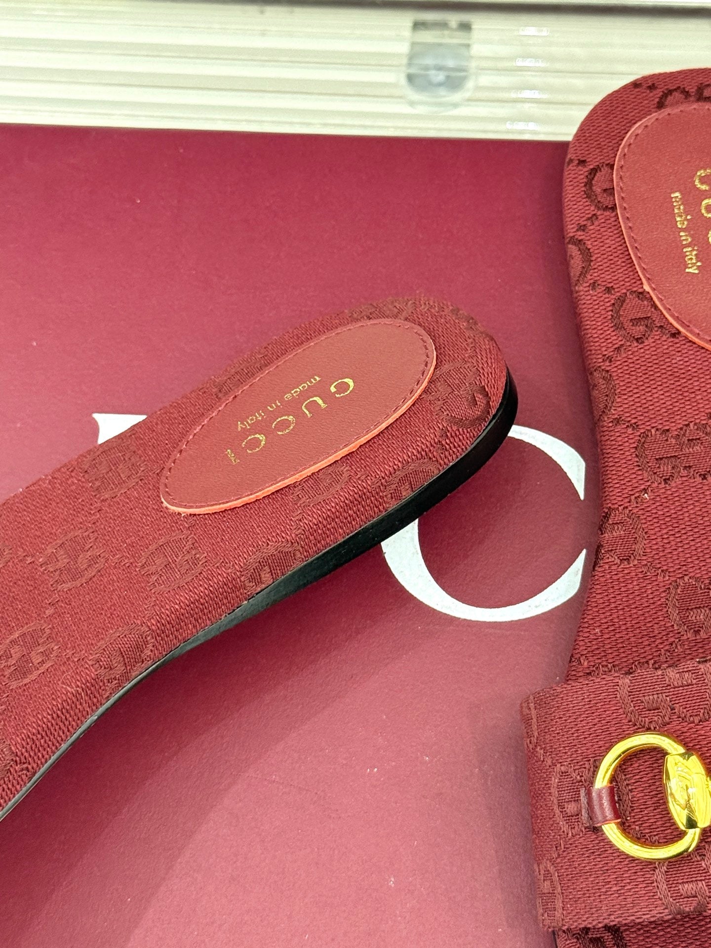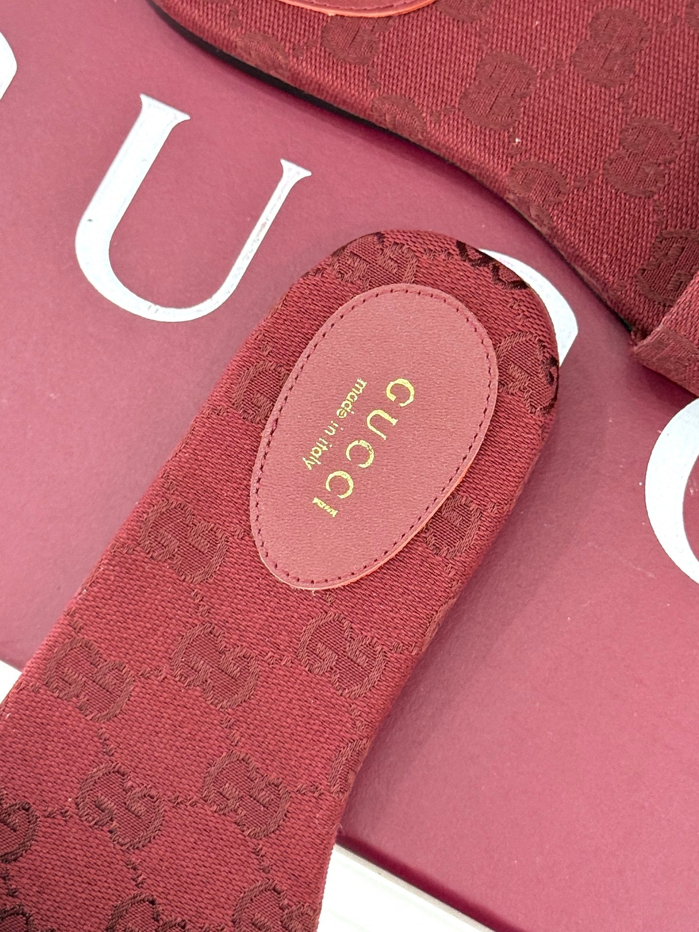 SLIDE SANDALS IN RED FABRIC EMBOSSED LOGO