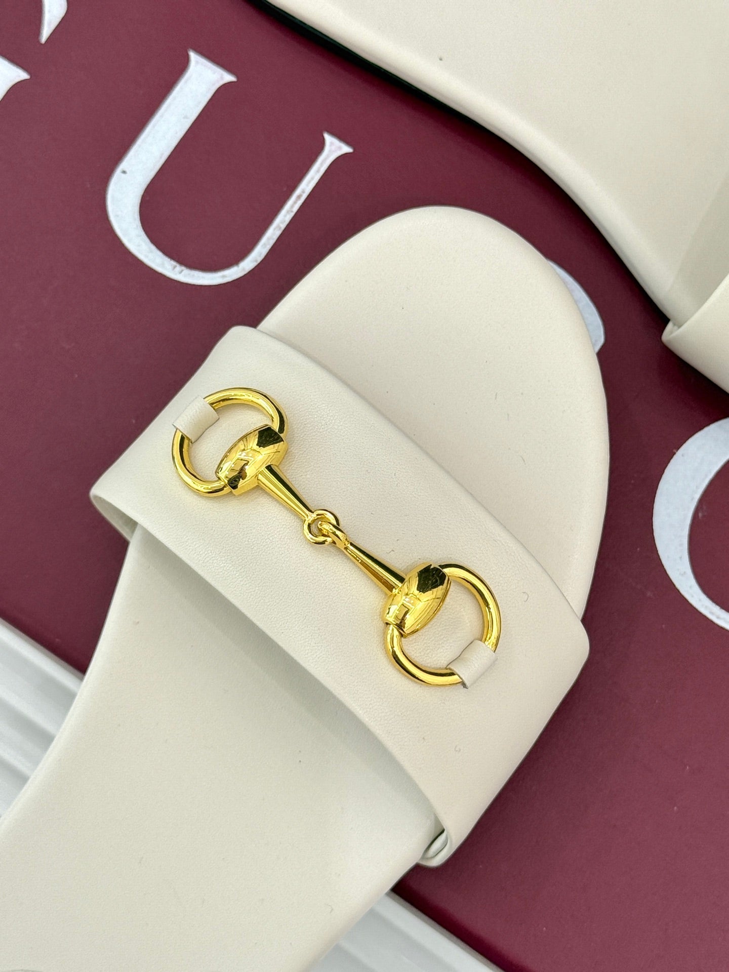 SLIDE SANDALS IN WHITE CALFSKIN WITH GOLD HARDWARE