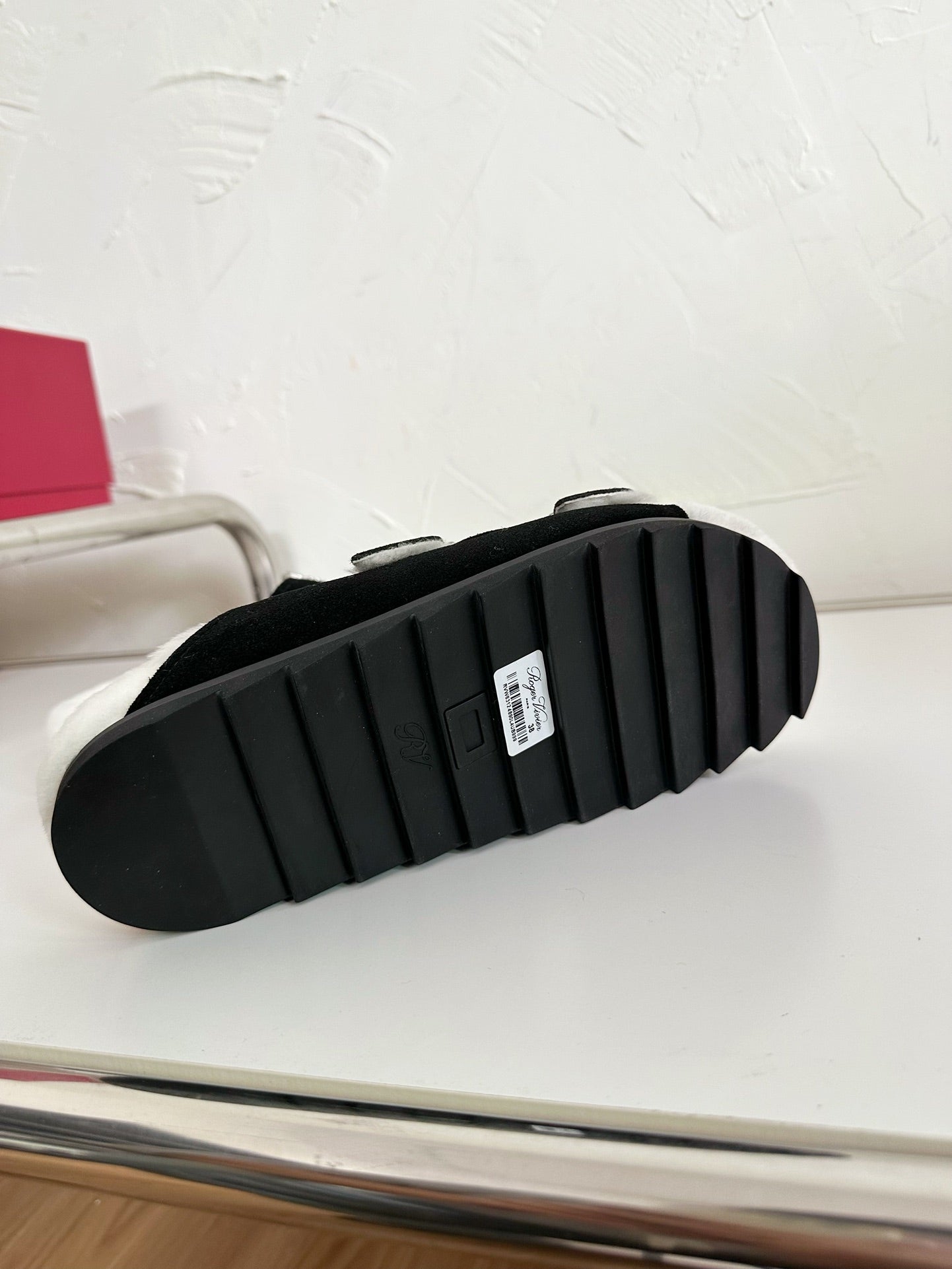 SLIDY VIV’ FUR STRASS BUCKLE MULES IN BLACK SUEDE AND CREAM SHEARLING INSOLE