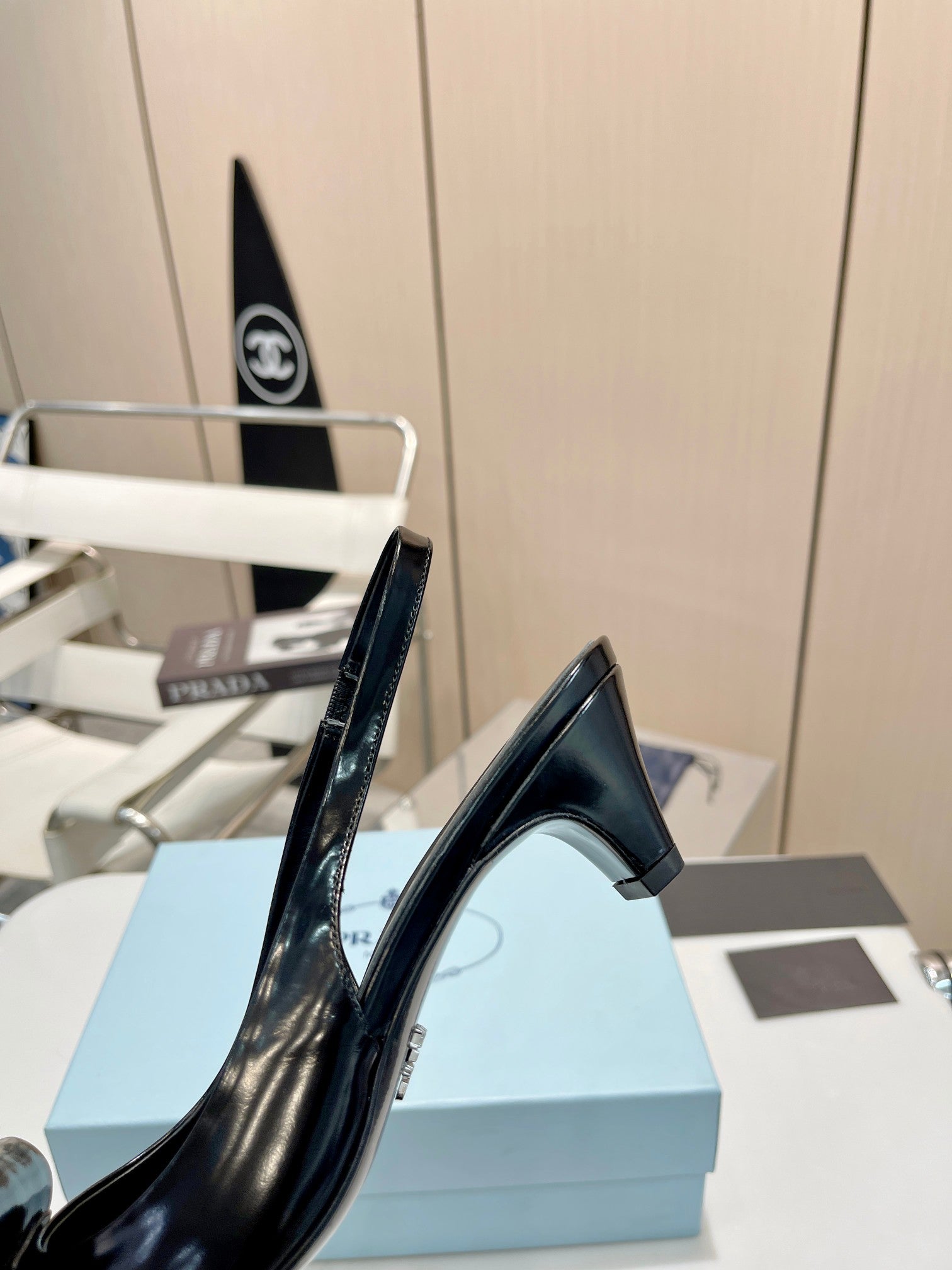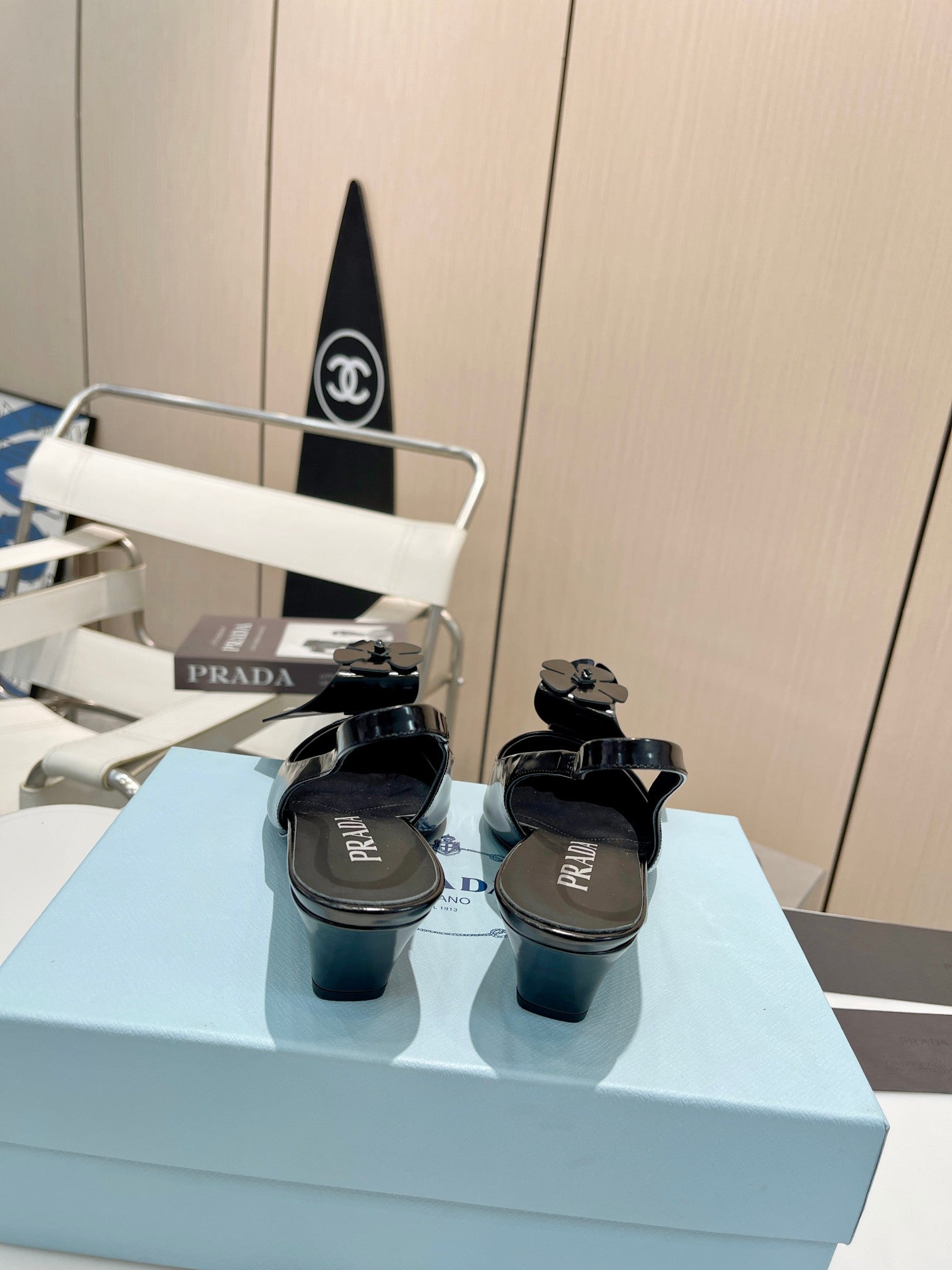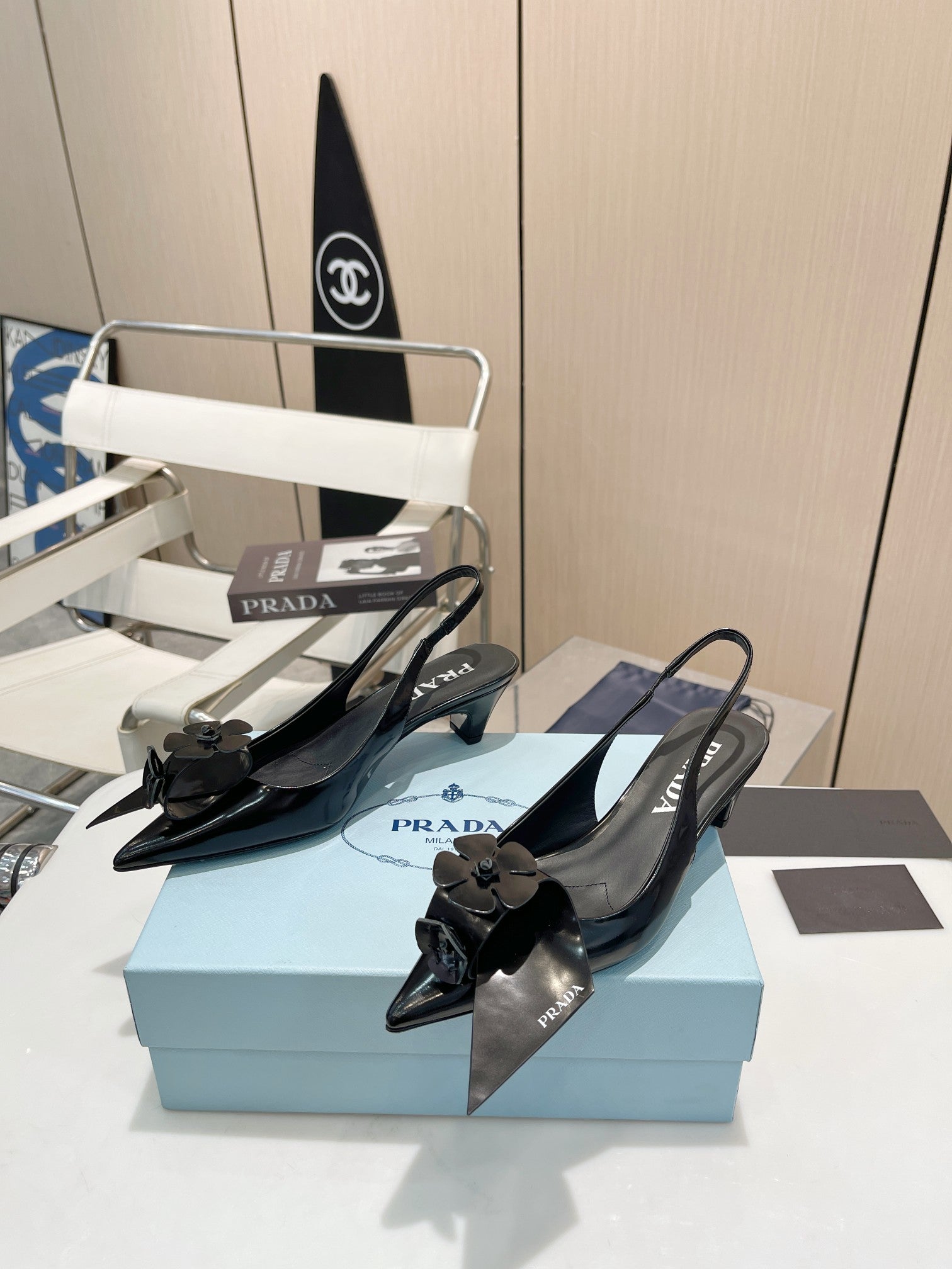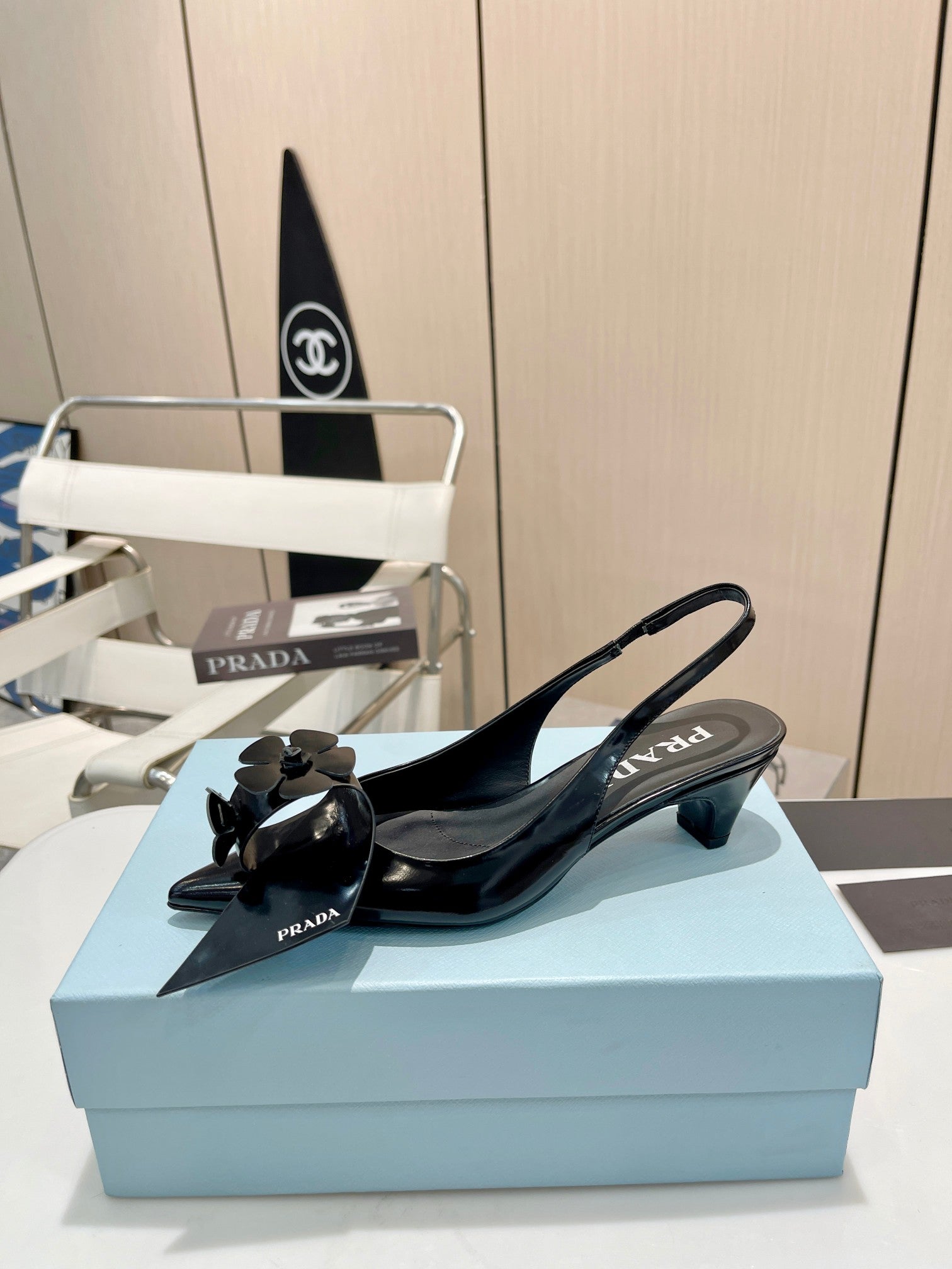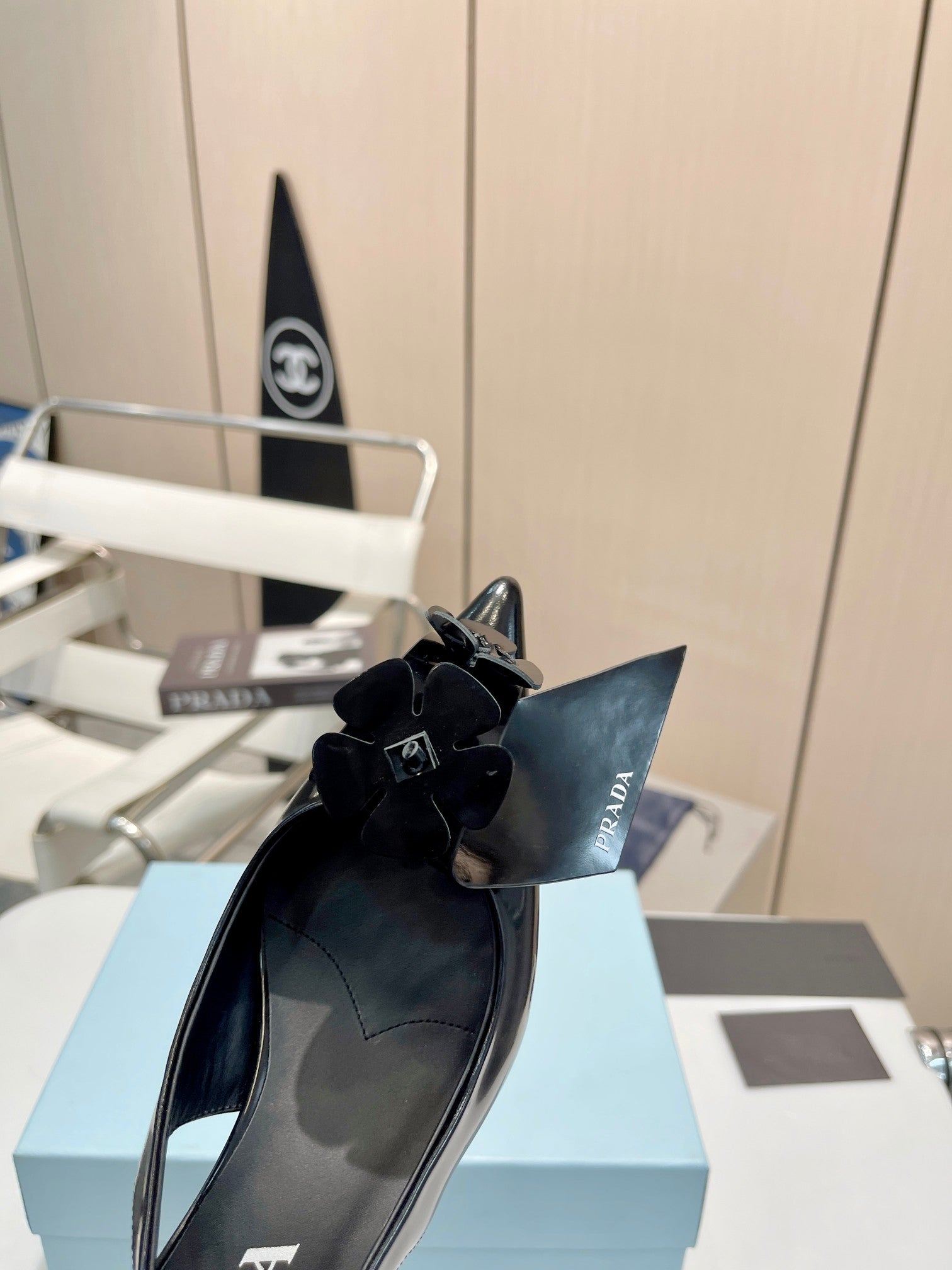 SLINGBACK KITTEN HEEL IN BLACK SHINY CALFSKIN ATTACHED FLOWERS
