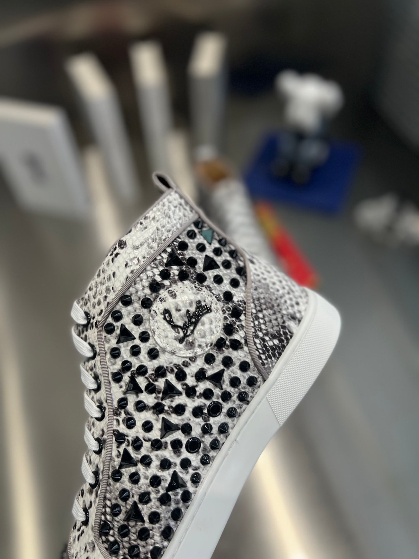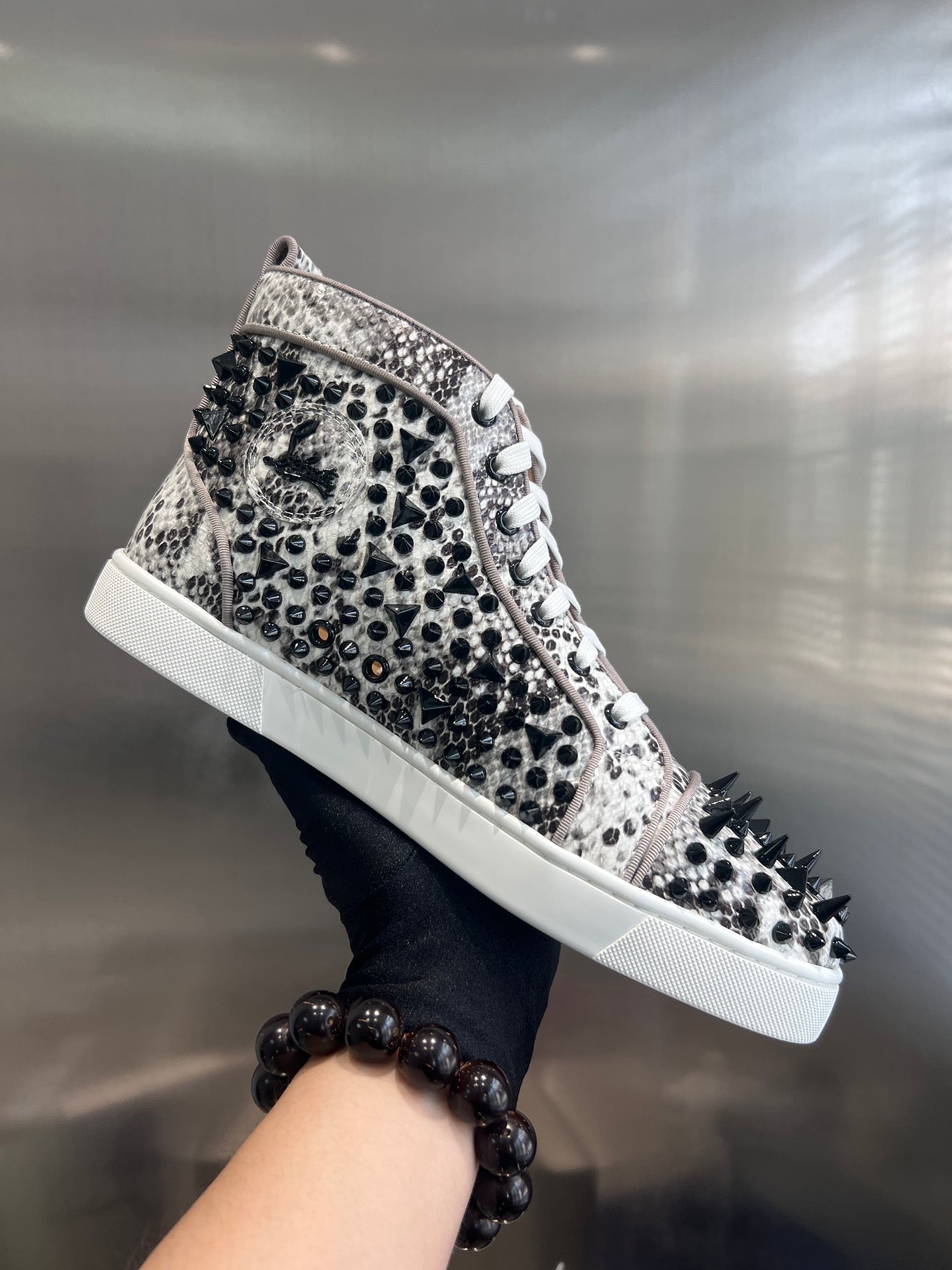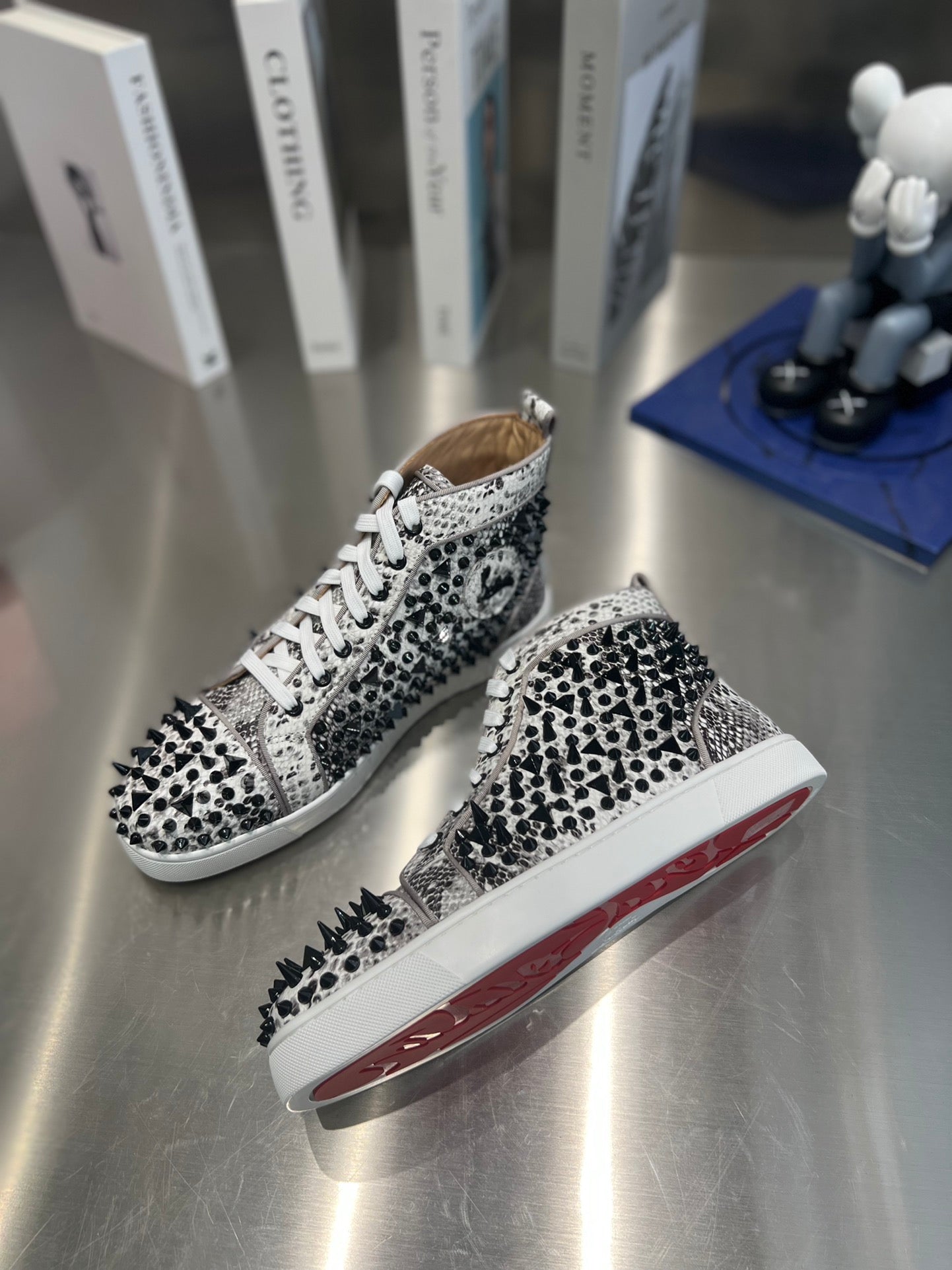 SPIKE STUDDED HIGH-TOP SNEAKERS IN WHITE MIX BLACK CALFSKIN