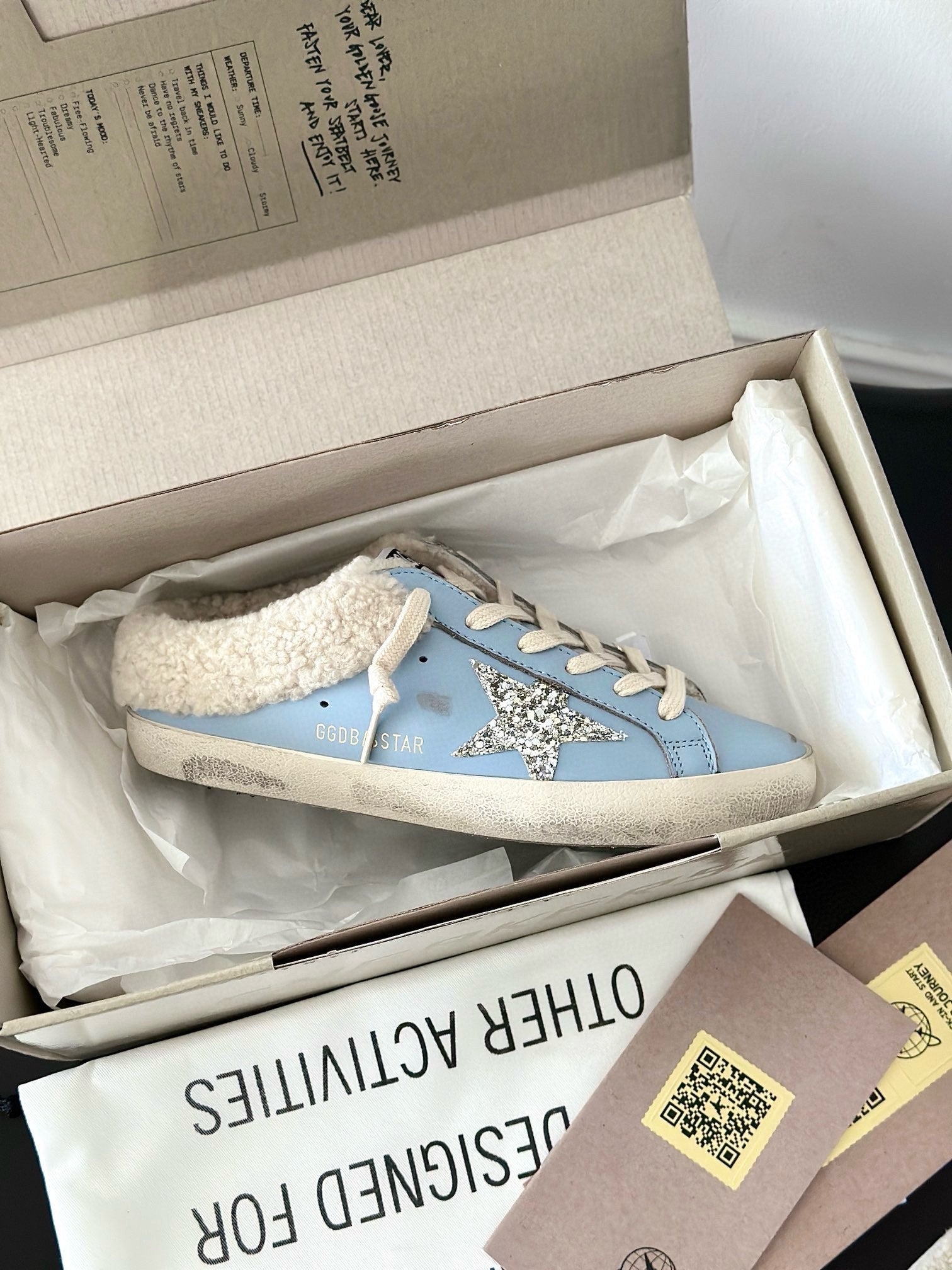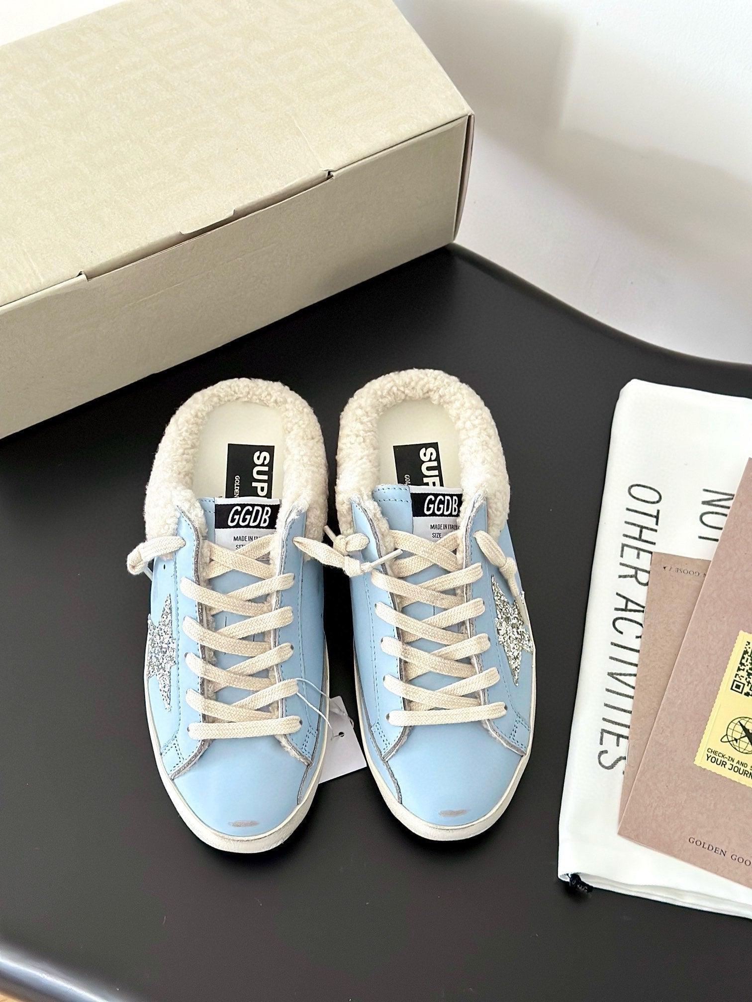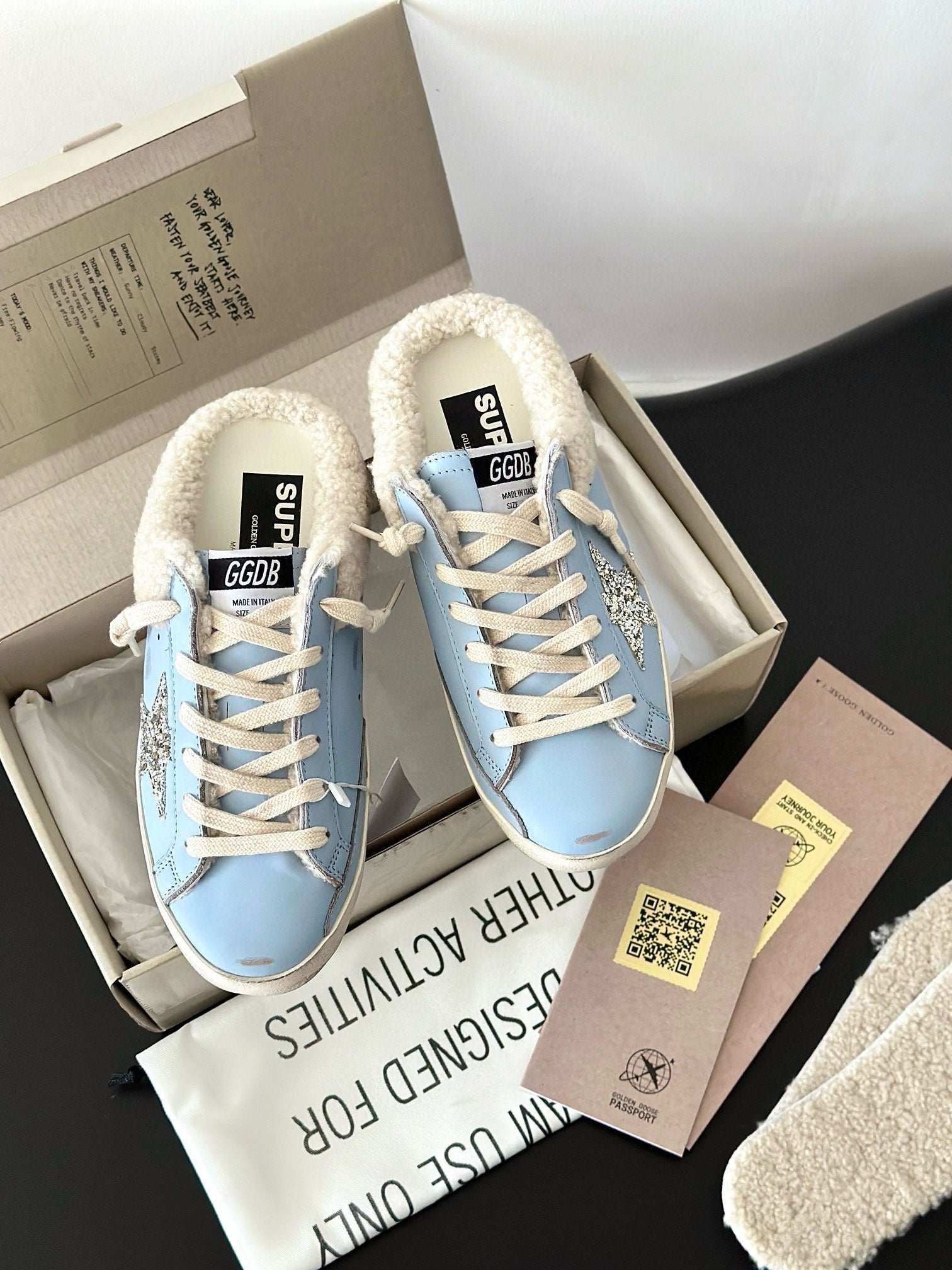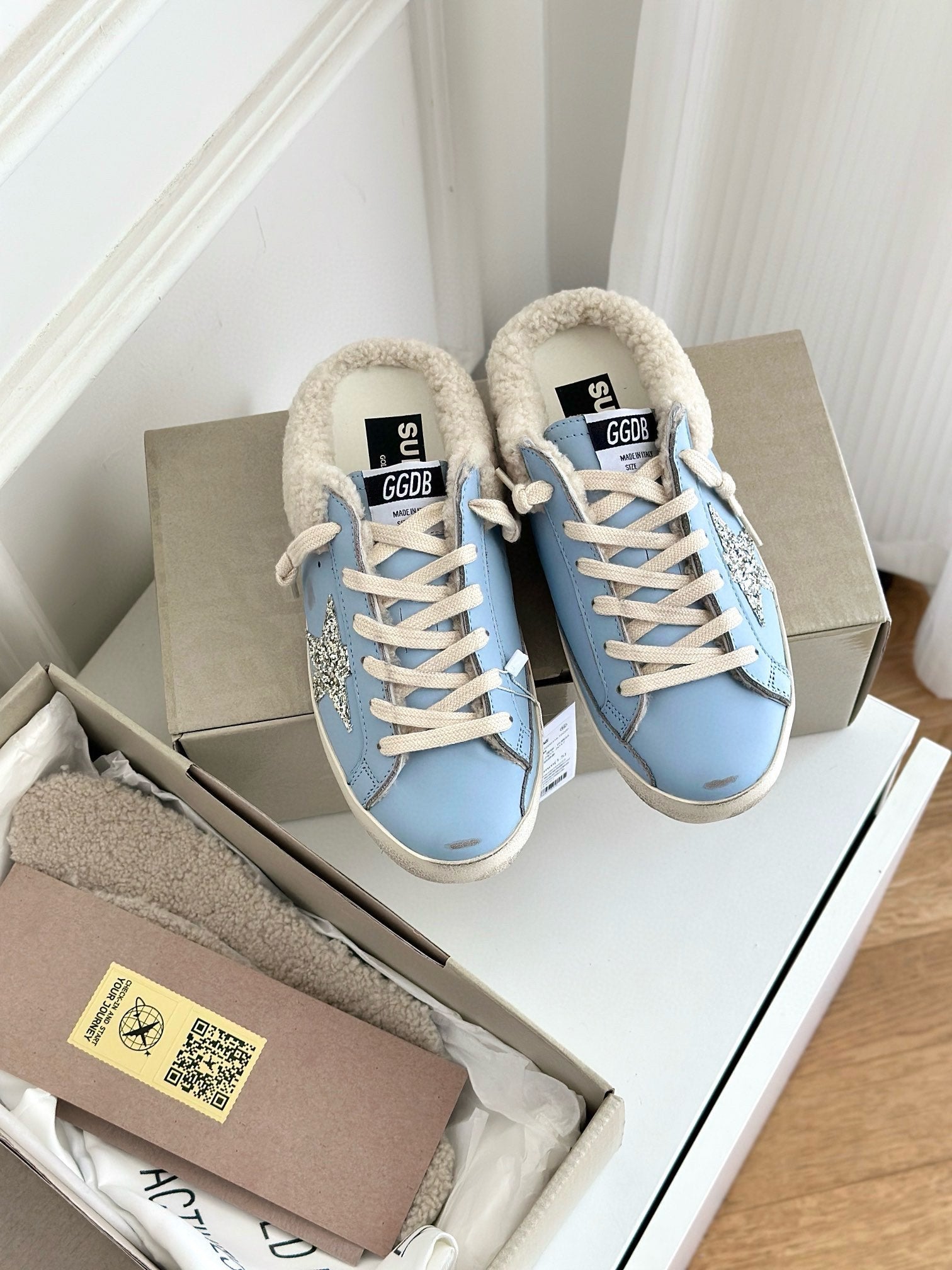 SUPER-STAR SABOTS IN BLUE CALFSKIN WITH GLITTER WHITE STAR