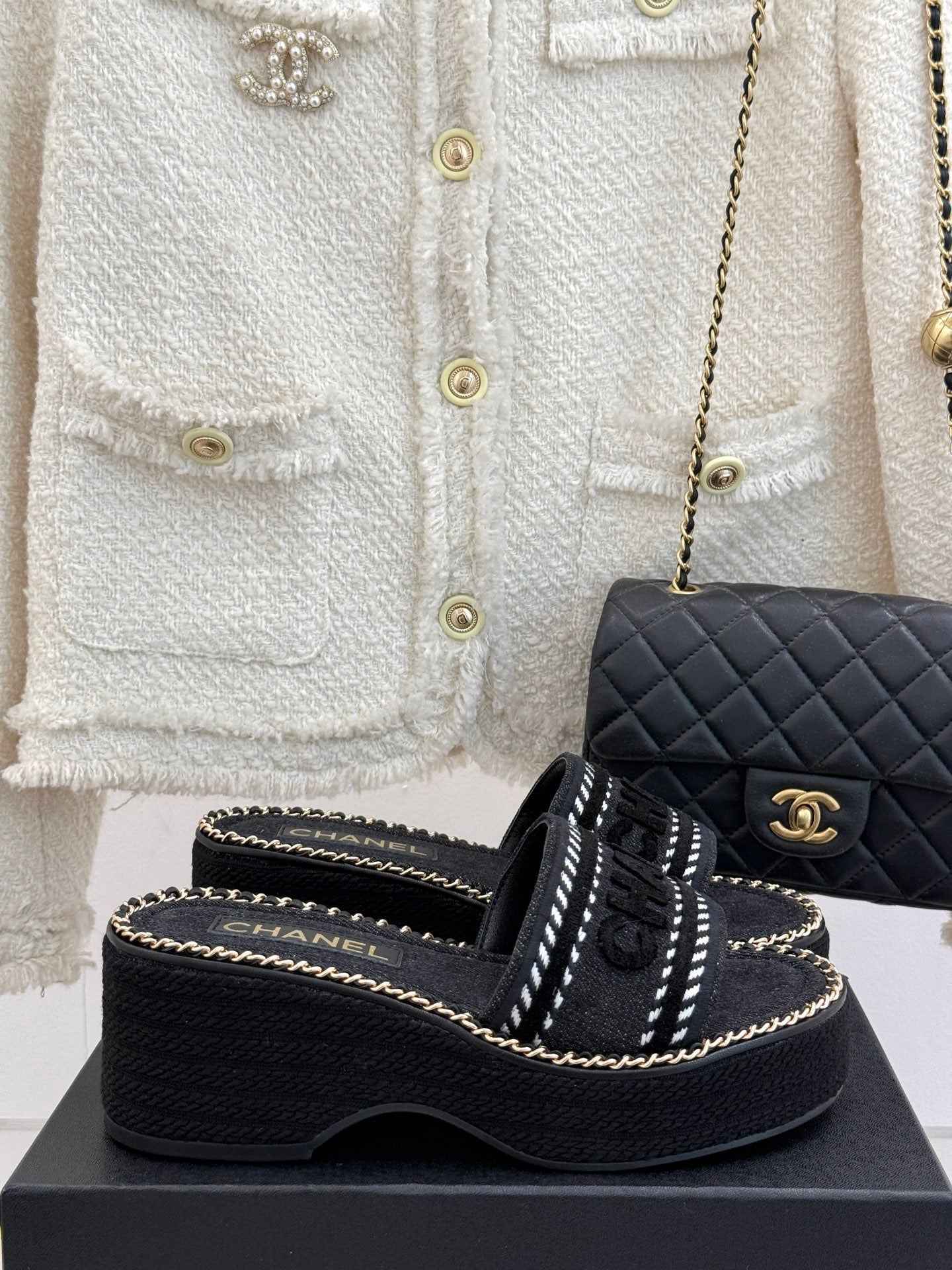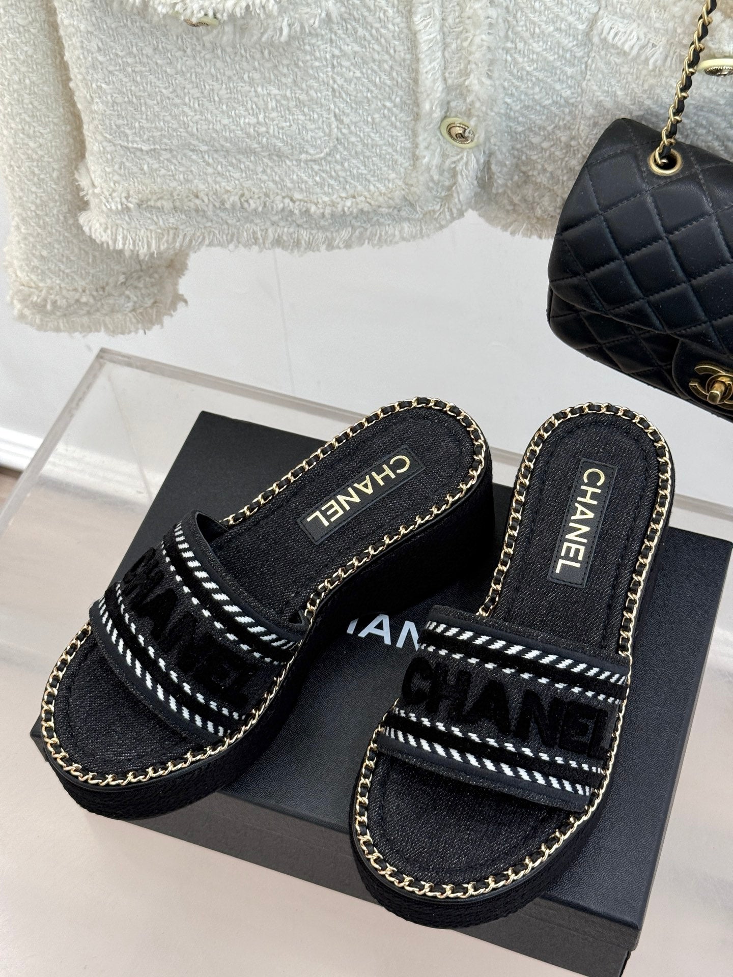 THICK SOLE WEDGE SLIPPERS IN BLACK DENIM FABRIC