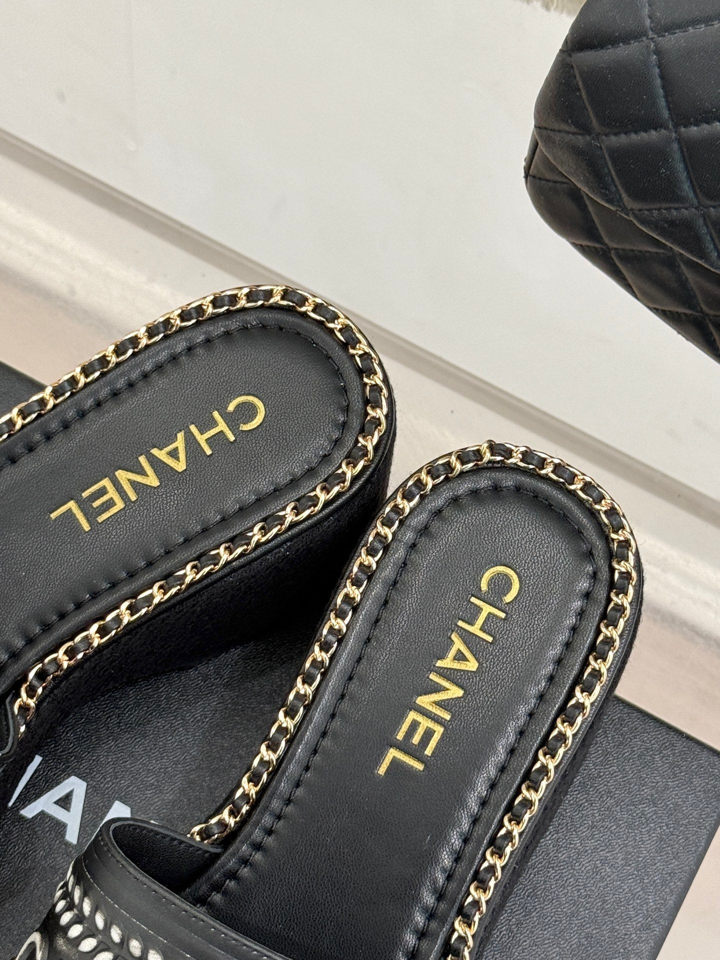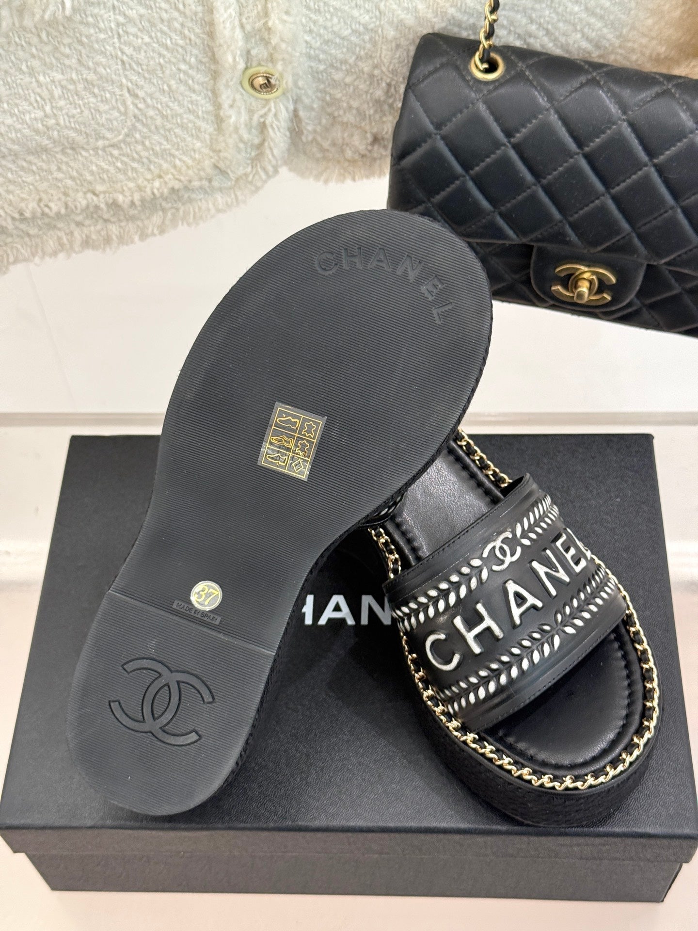 THICK SOLE WEDGE SLIPPERS IN BLACK MIX WHITE CALFSKIN