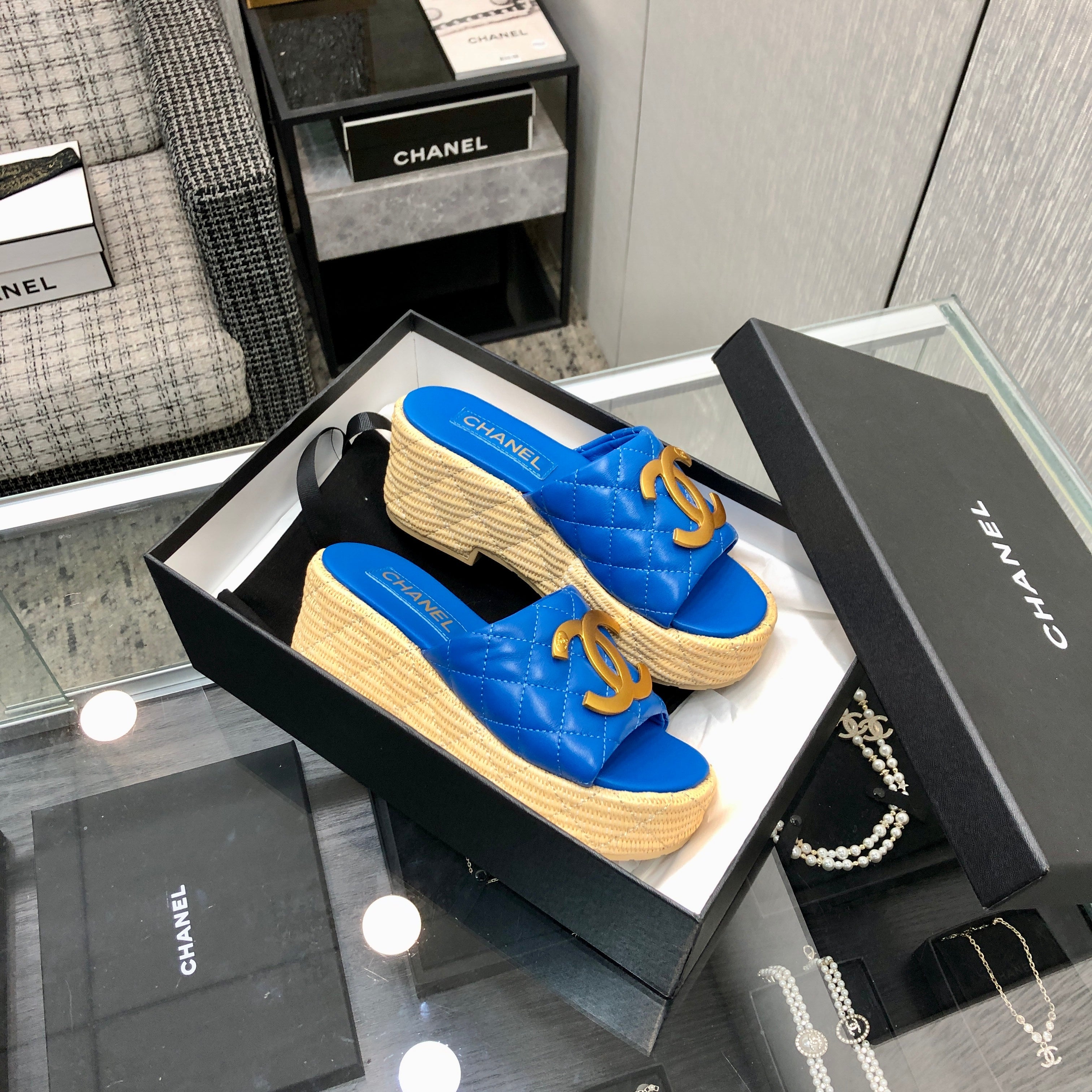 THICK SOLE WEDGE SLIPPERS IN COBALT BLUE LAMBSKIN AND BEIGE RUBBER