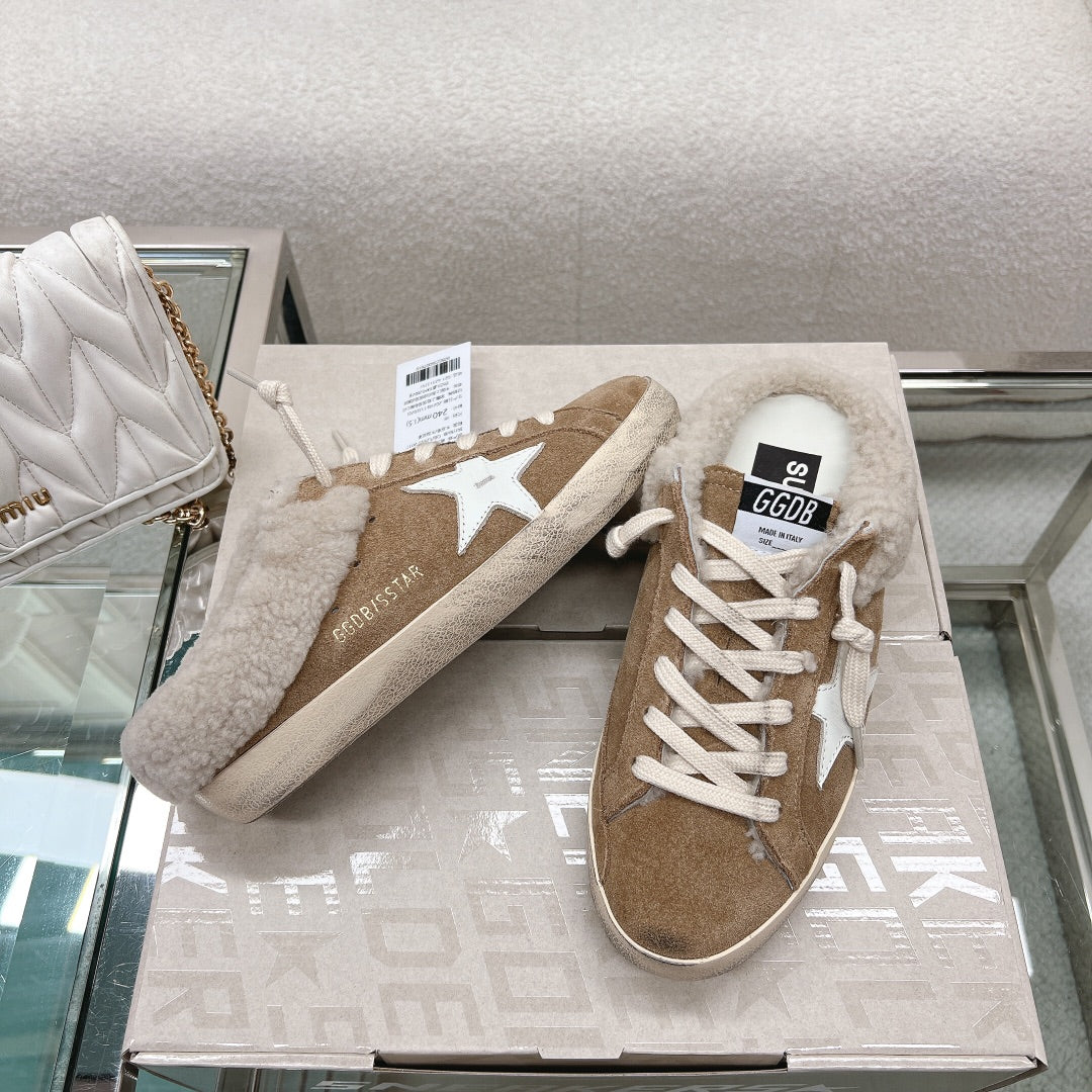 THICK-SOLED SUPER-STAR SABOTS IN BROWN SUEDE WITH WHITE STAR