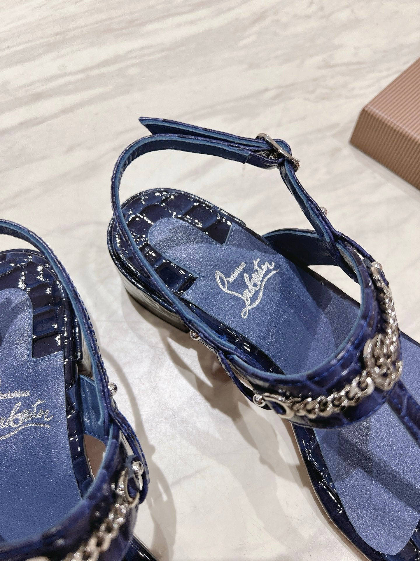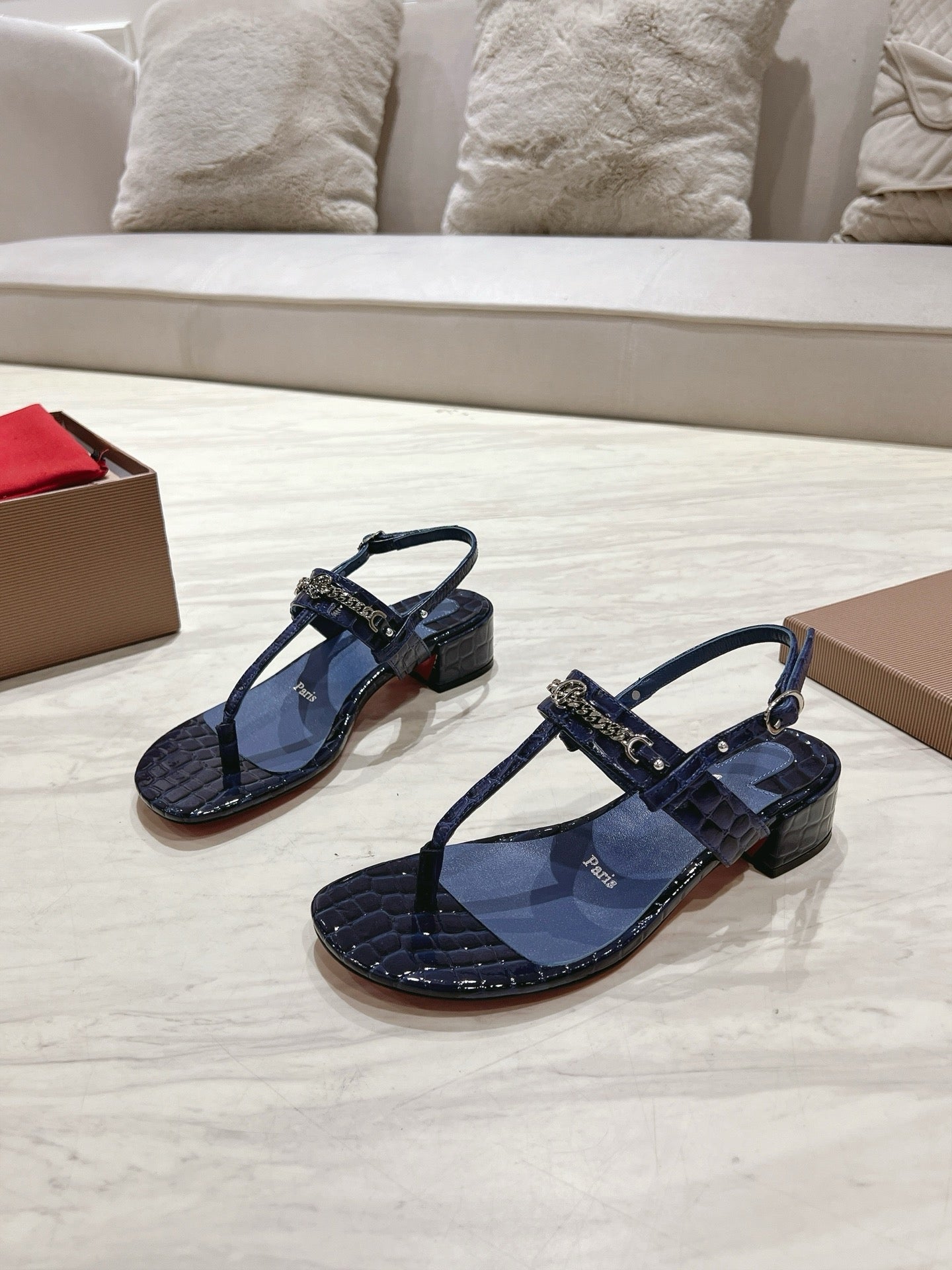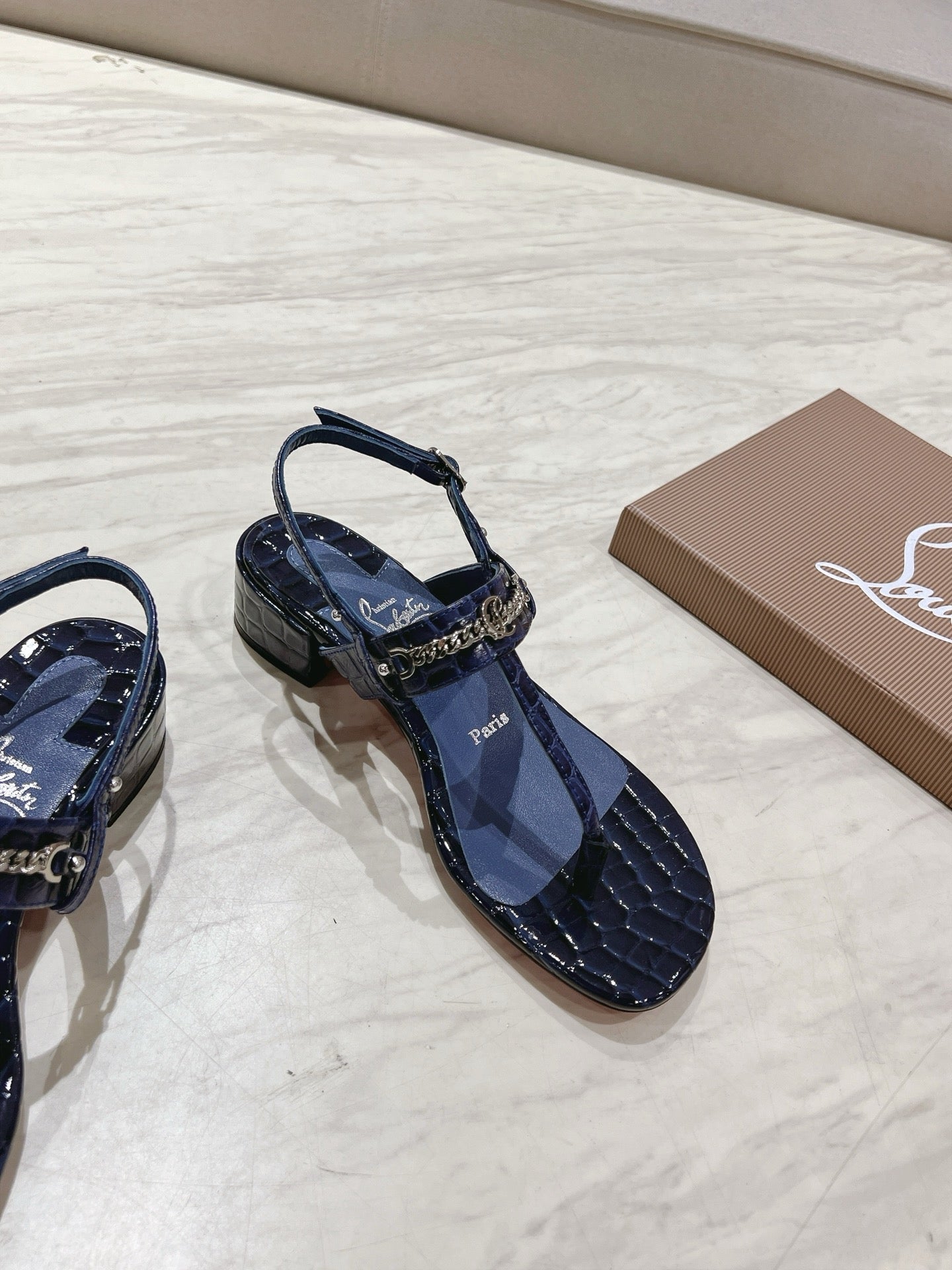 THONG SANDALS SLINGBACK 25MM IN SNAKE-EFFECT DARK BLUE CALFSKIN