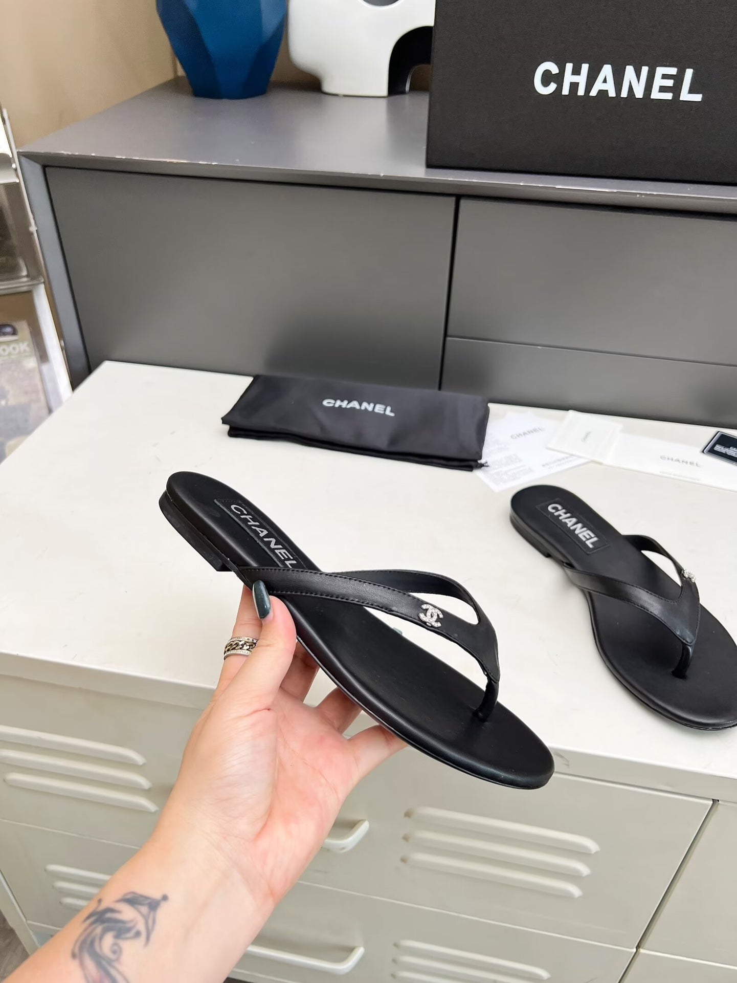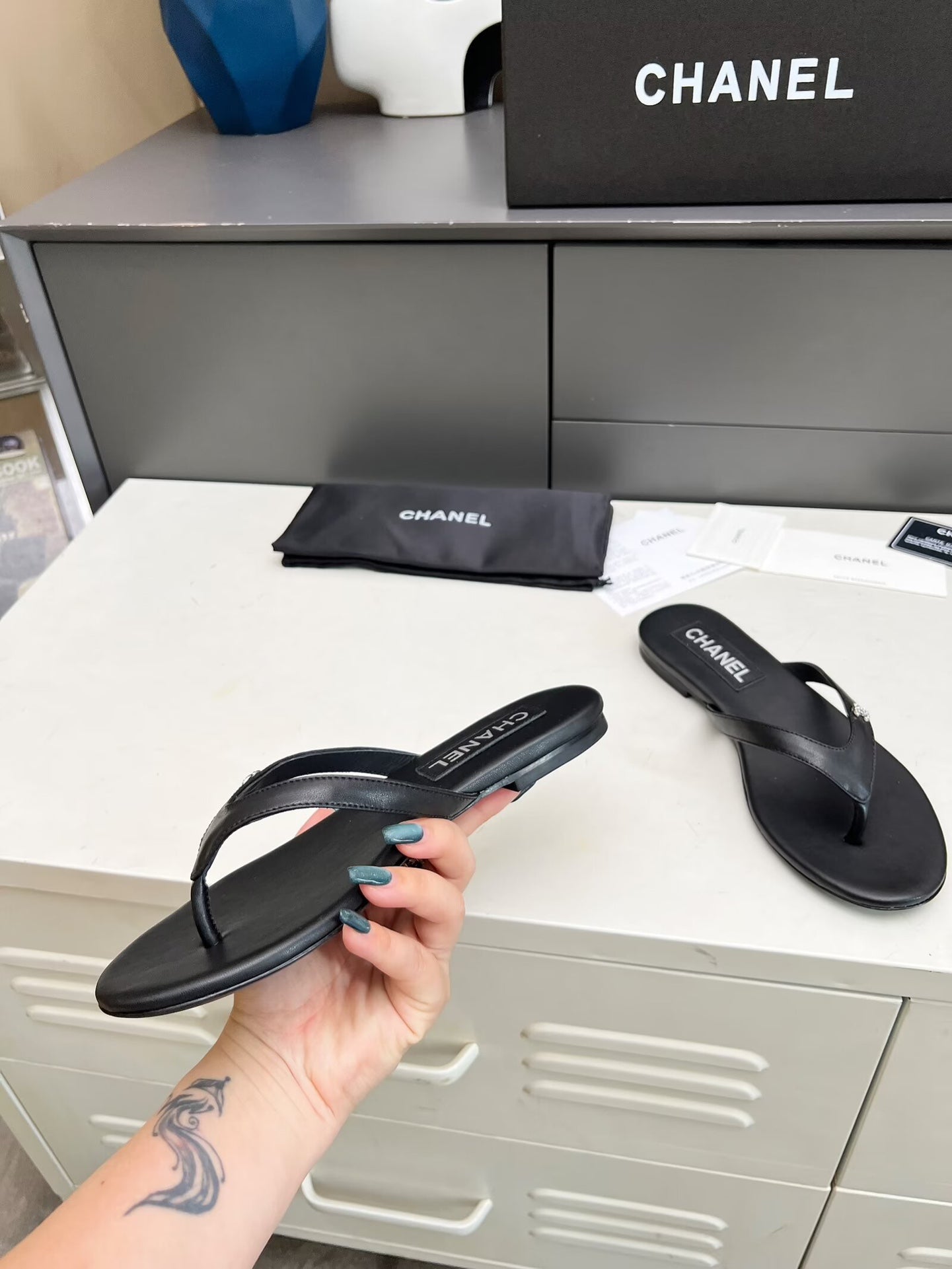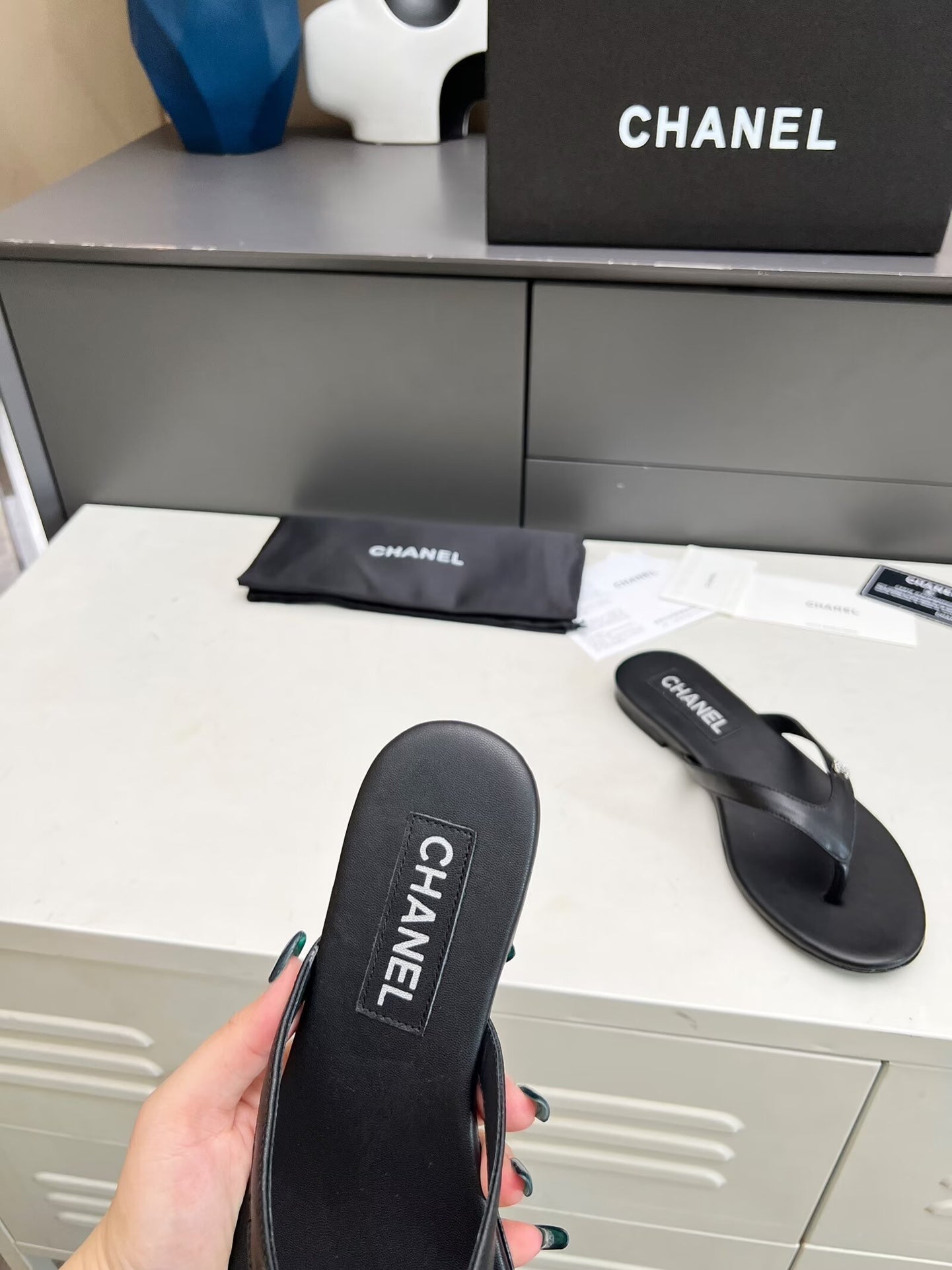 THONG SLIPPERS IN BLACK COWHIDE