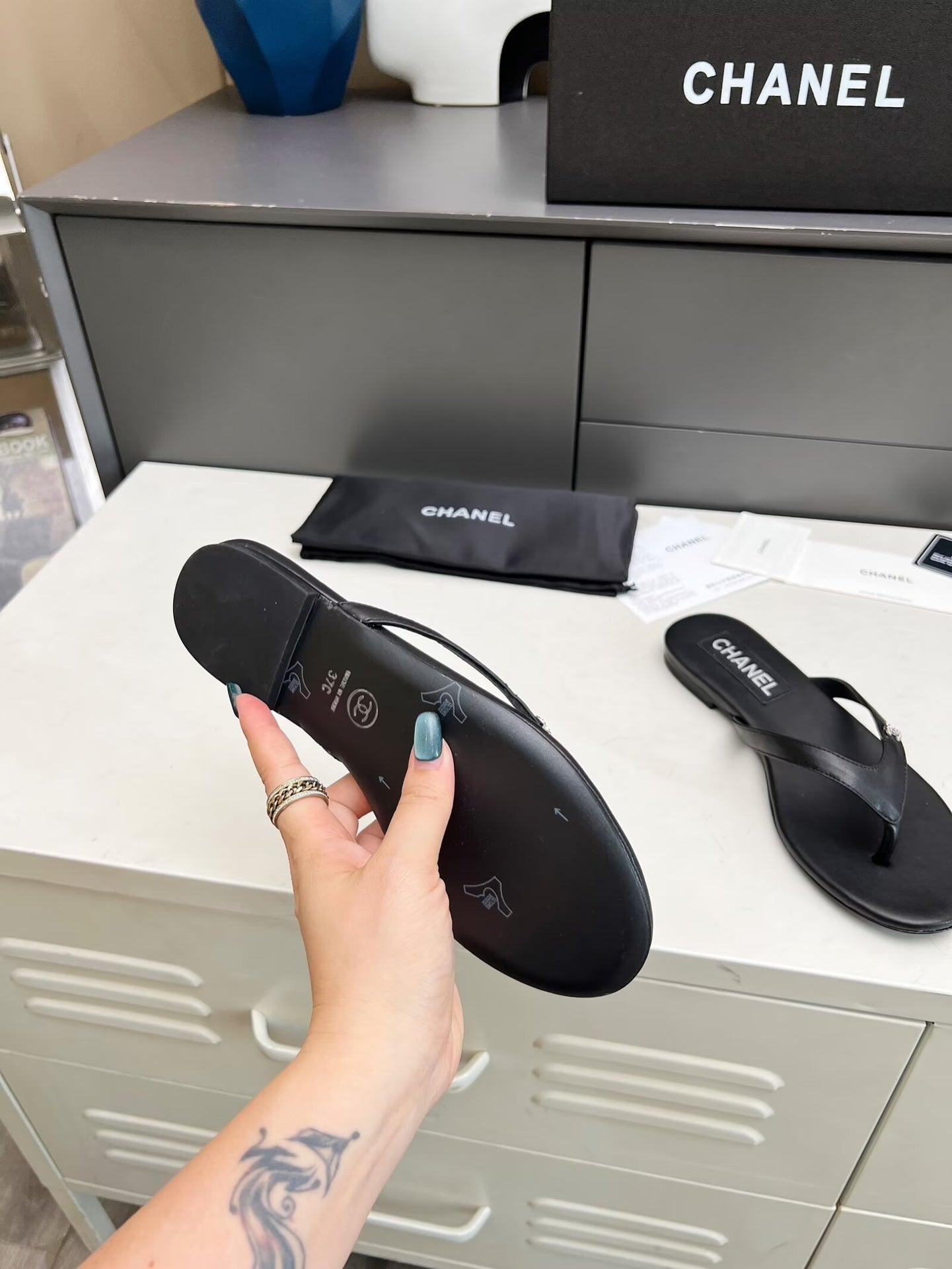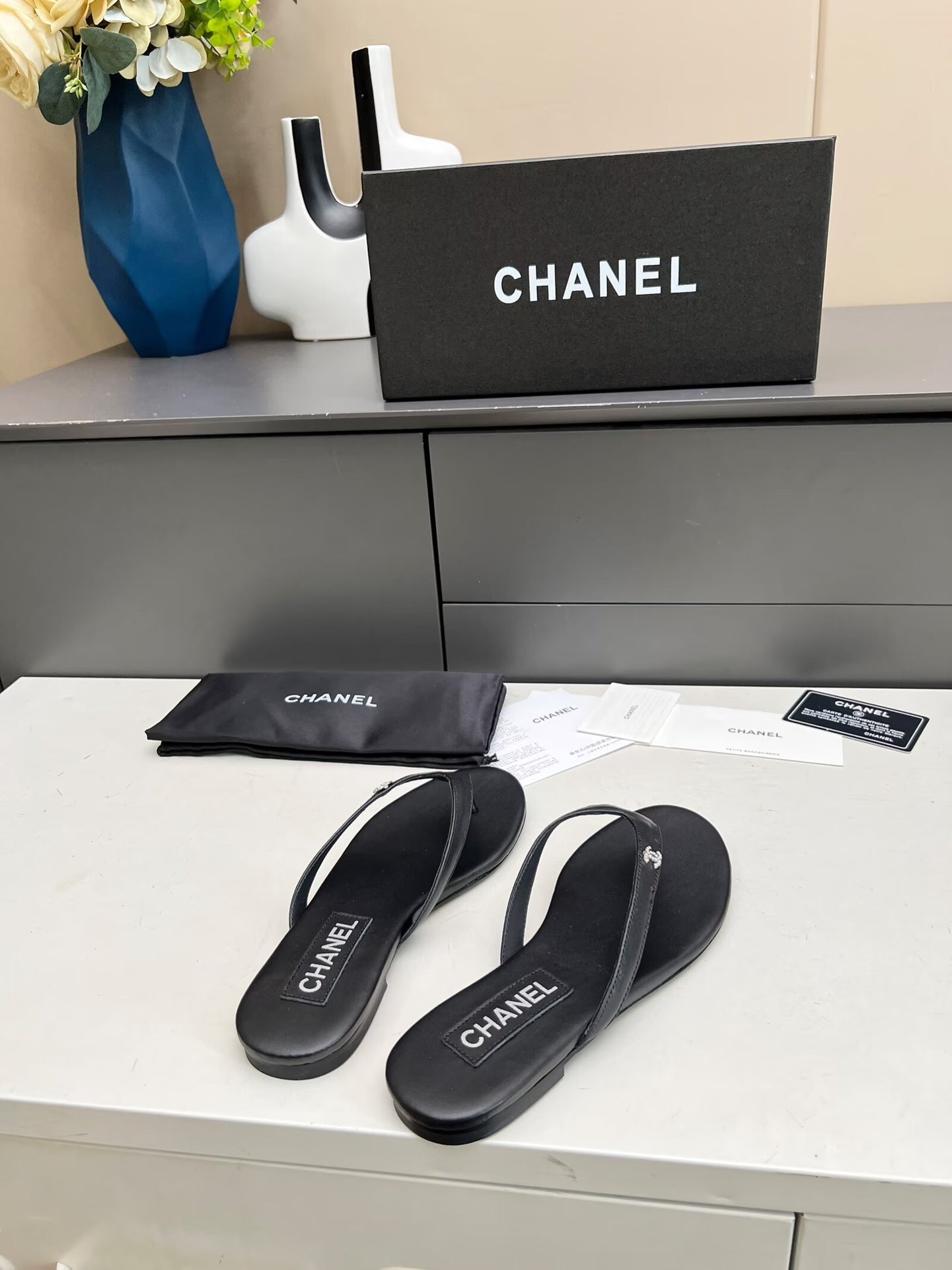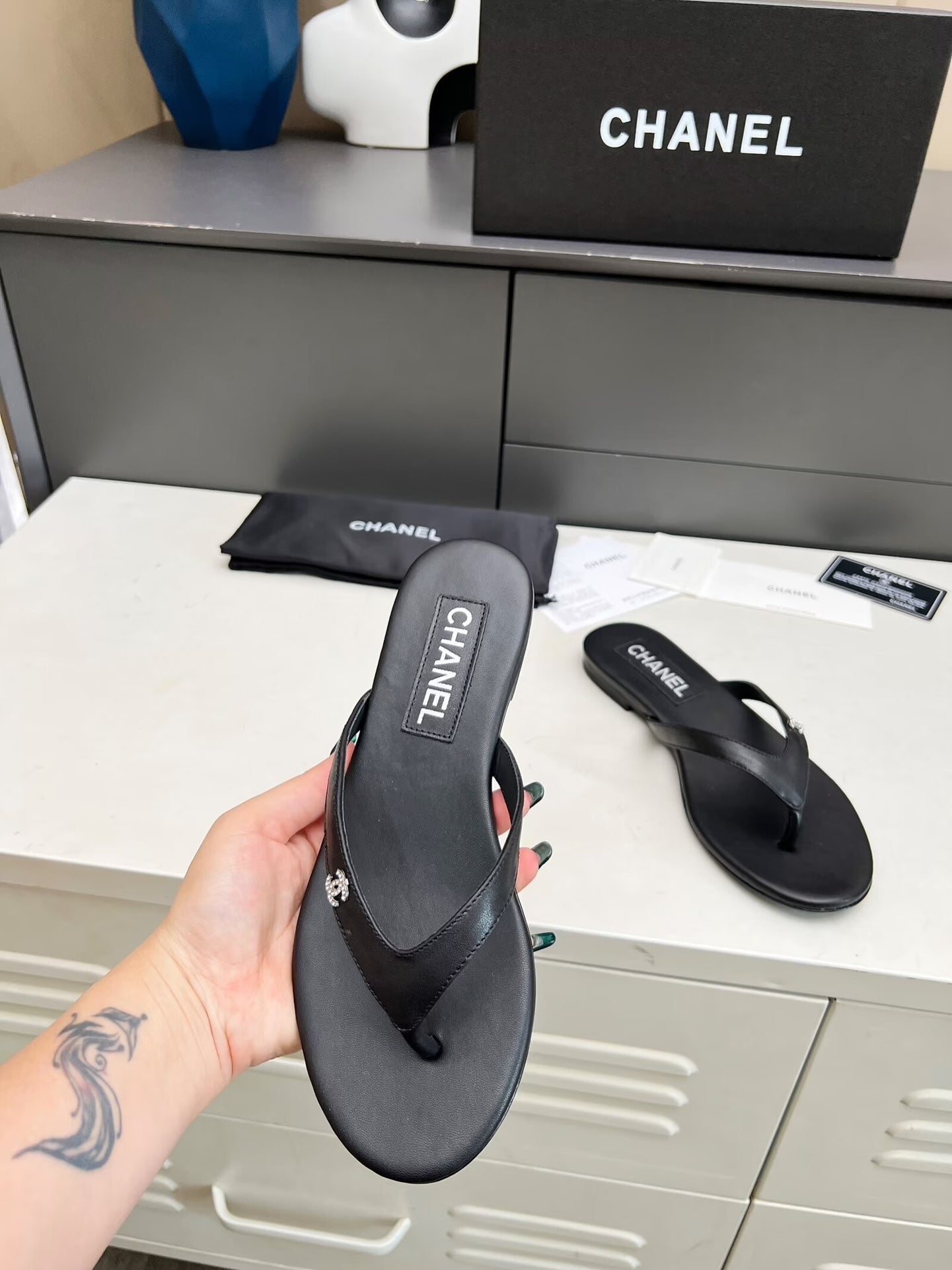 THONG SLIPPERS IN BLACK COWHIDE