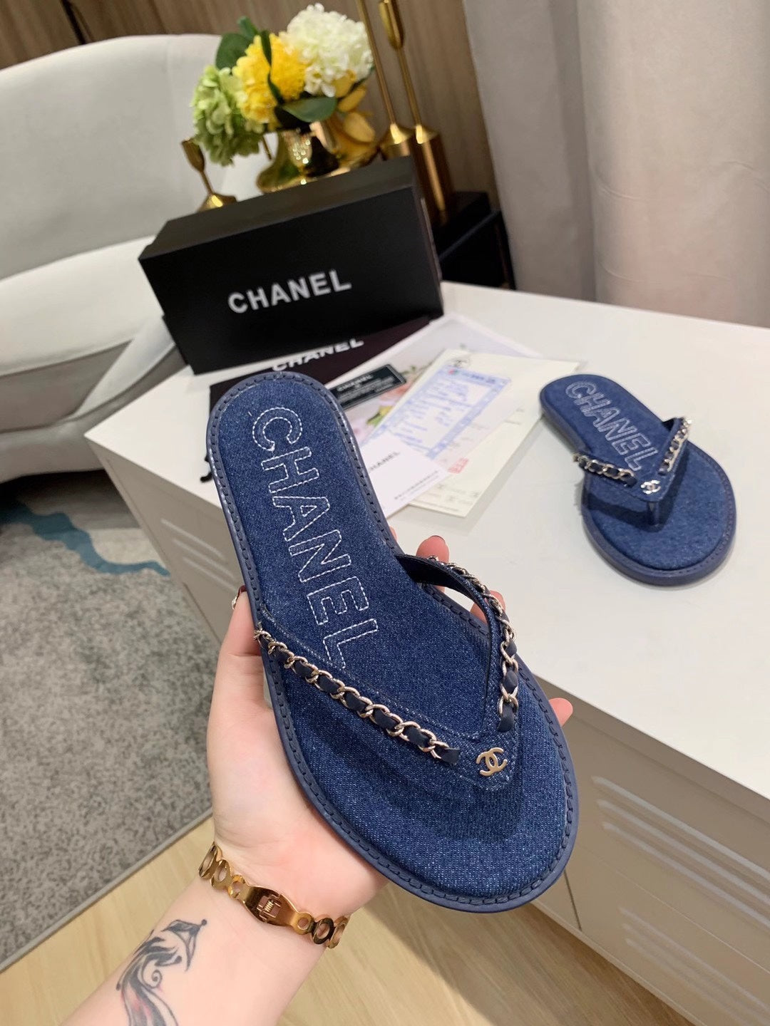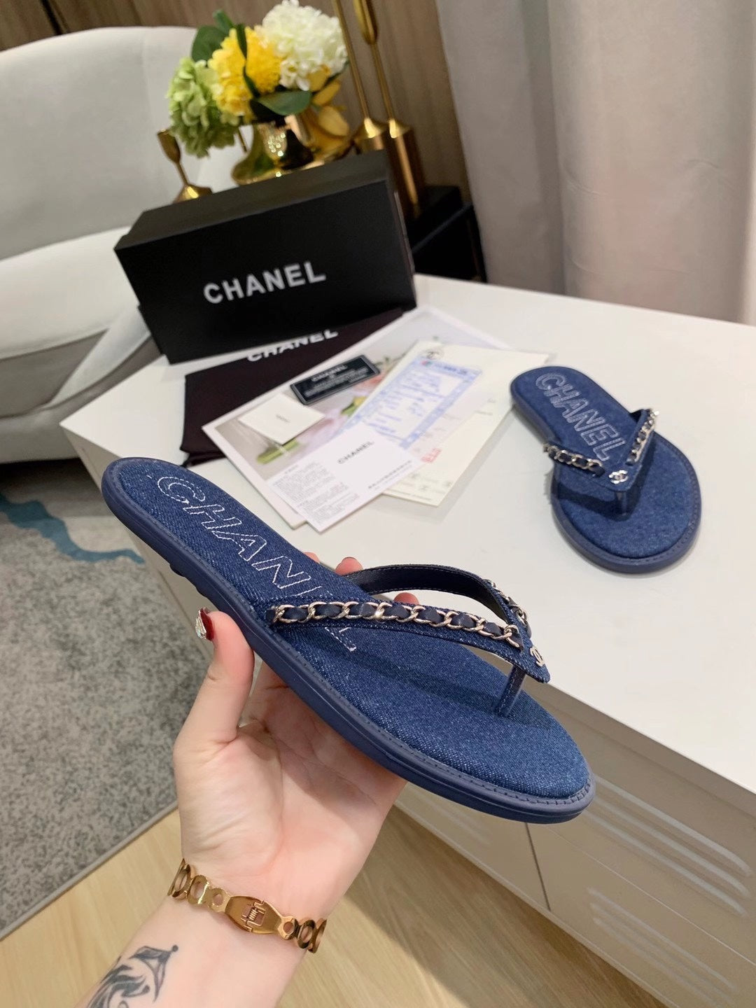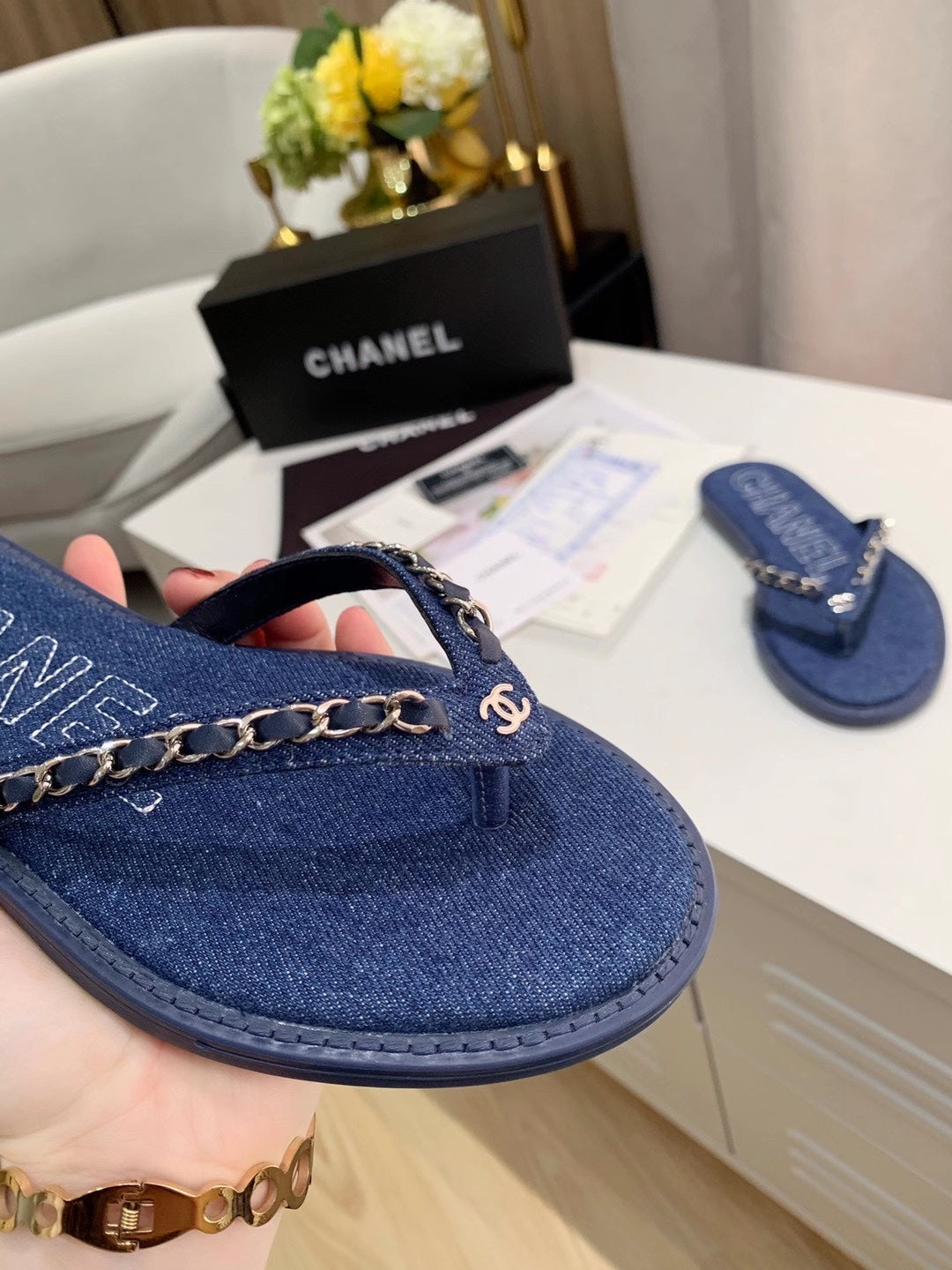 THONG SLIPPERS IN COBALT BLUE DENIM