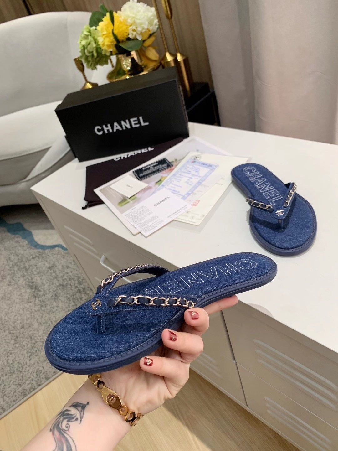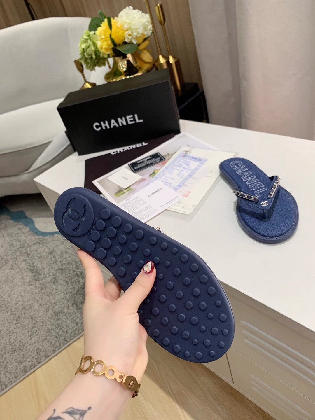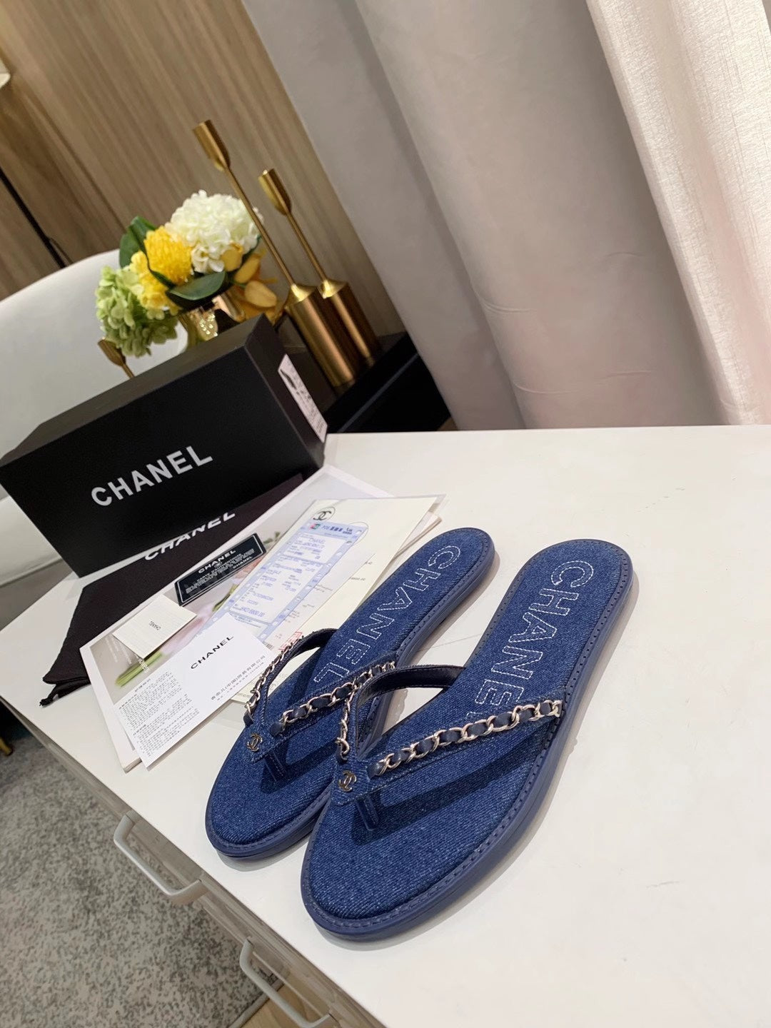 THONG SLIPPERS IN COBALT BLUE DENIM
