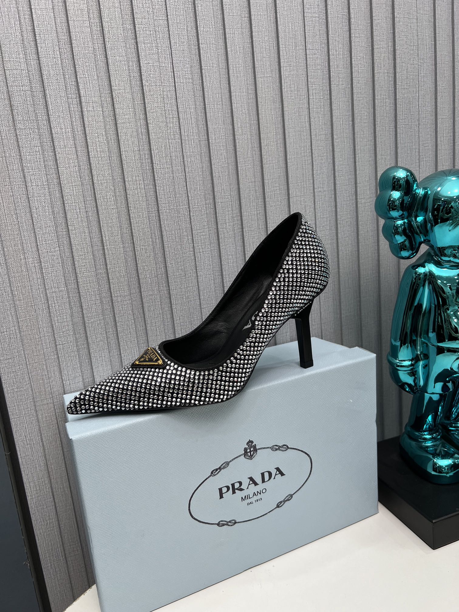 TRIANGLE LOGO HIGH-HEEL PUMPS IN BLACK SATIN WITH WHITE CRYSTALS