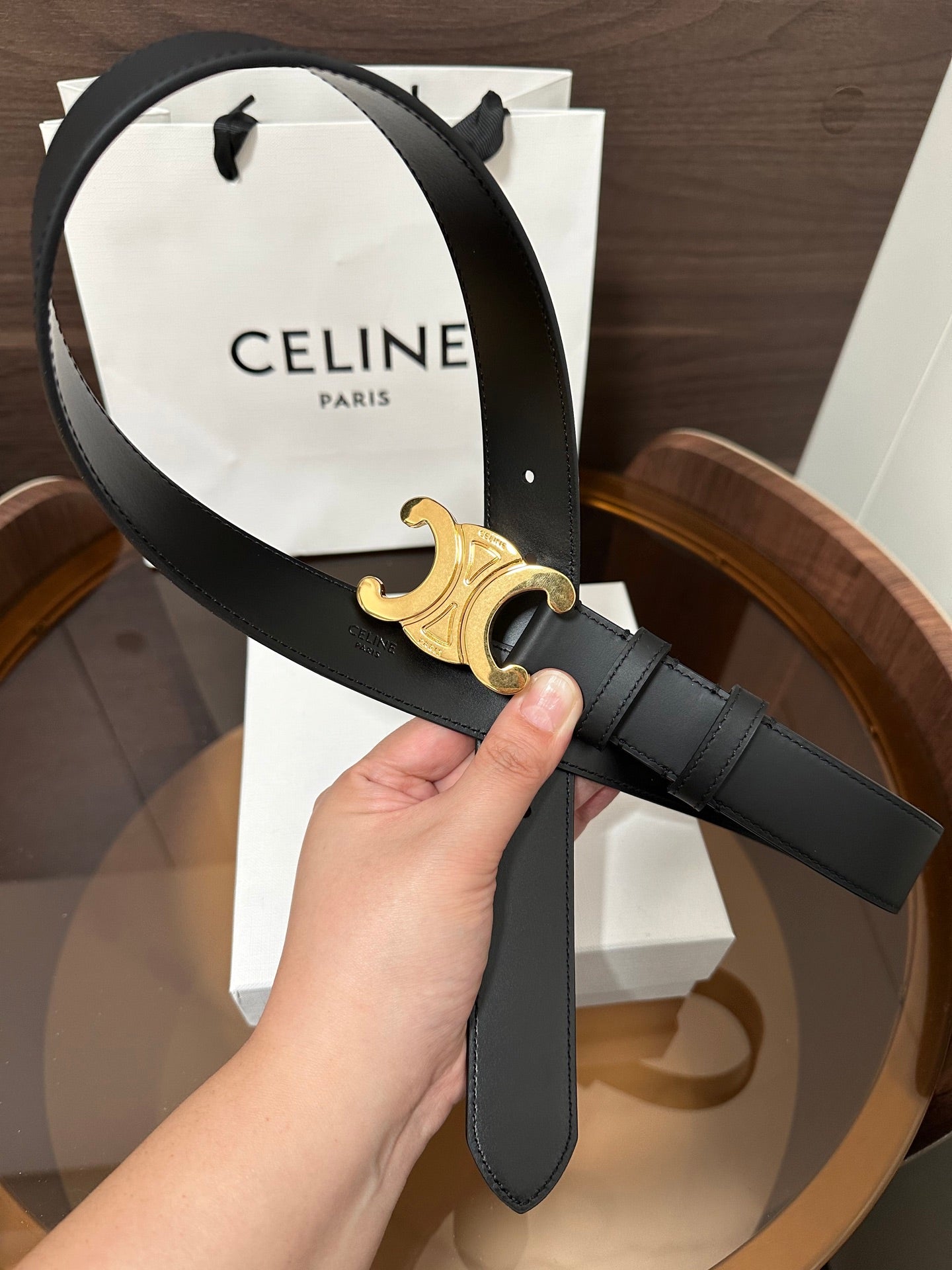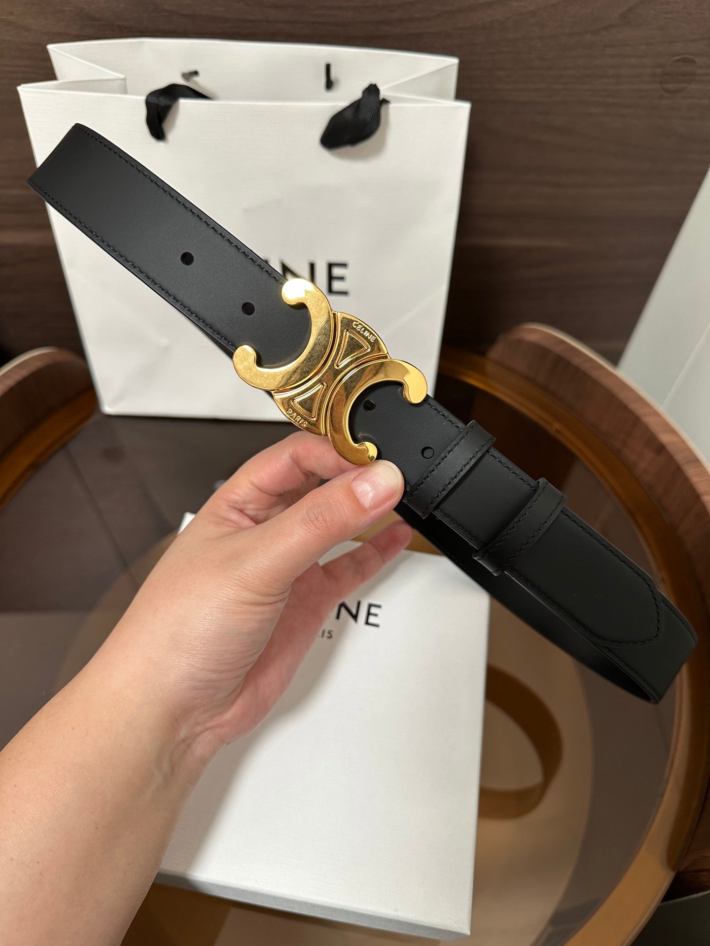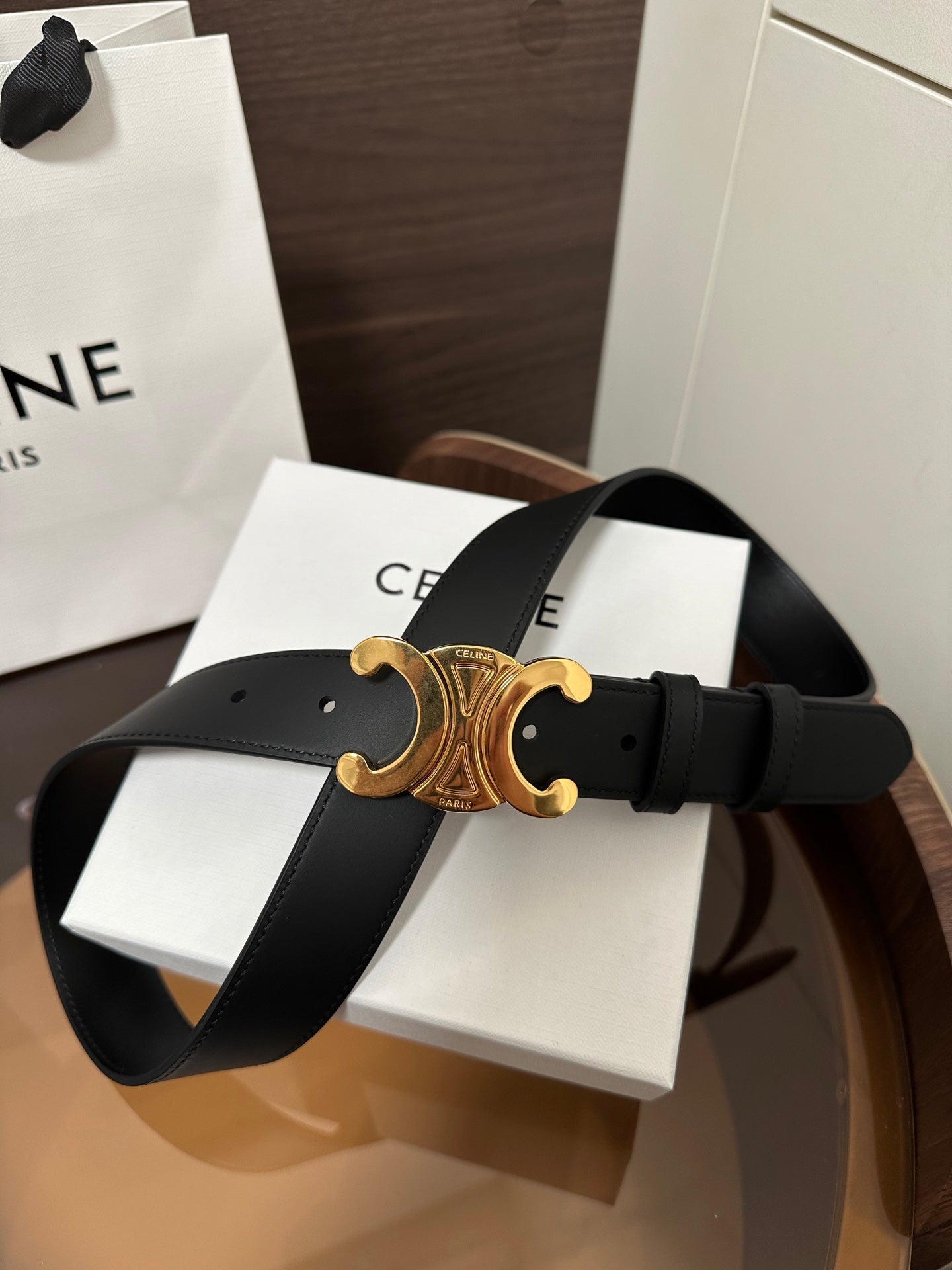 TRIOMPHE BELT 30MM IN BLACK CALFSKIN WITH GOLD BUCKLE
