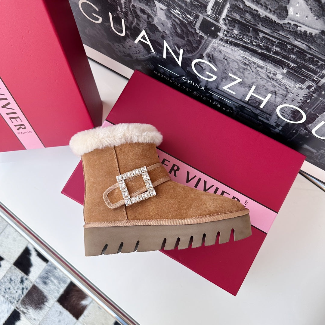 VIV' WINTER FUR STRASS BUCKLE ANKLE BOOTS IN TAN BROWN SUEDE