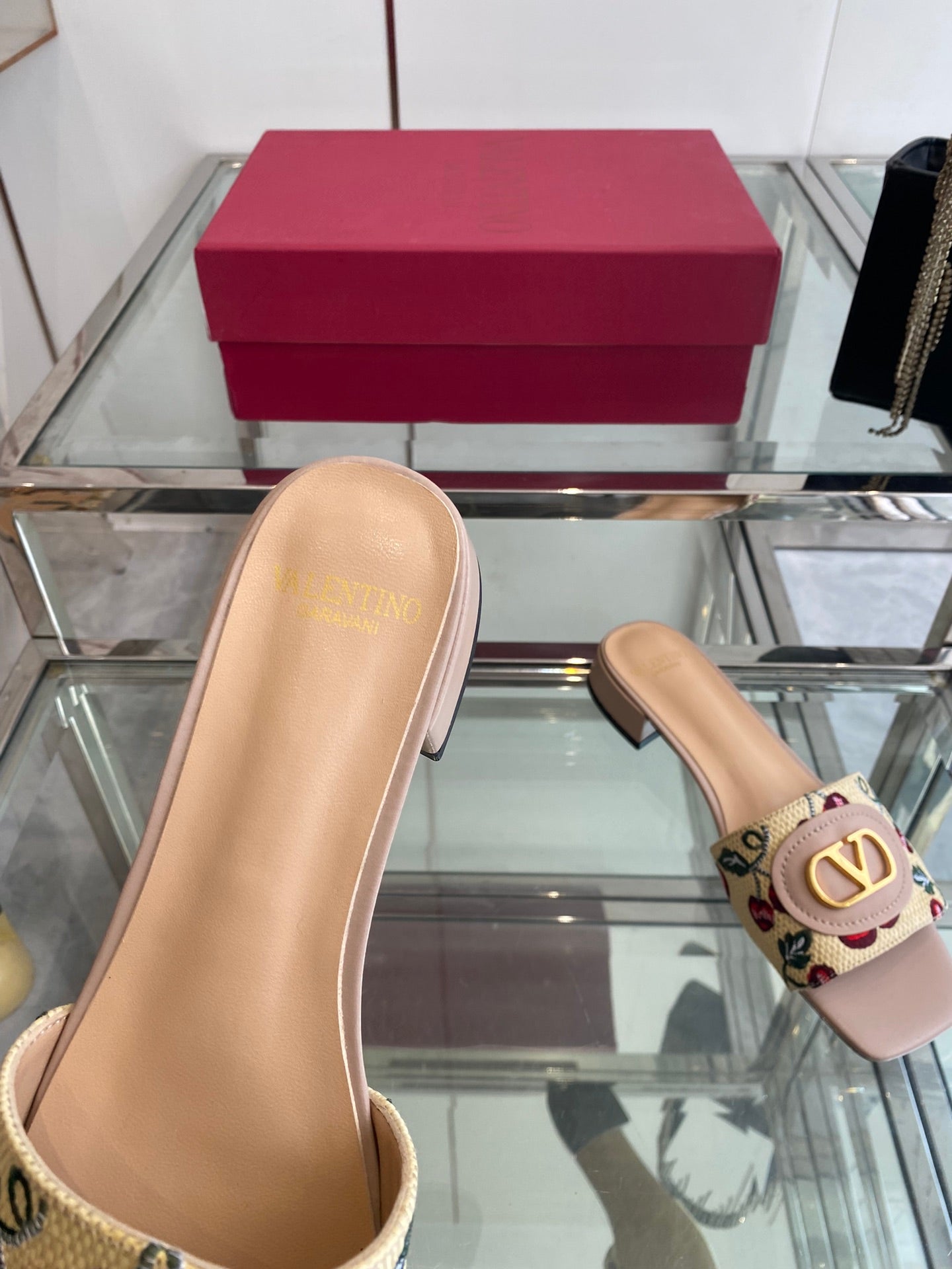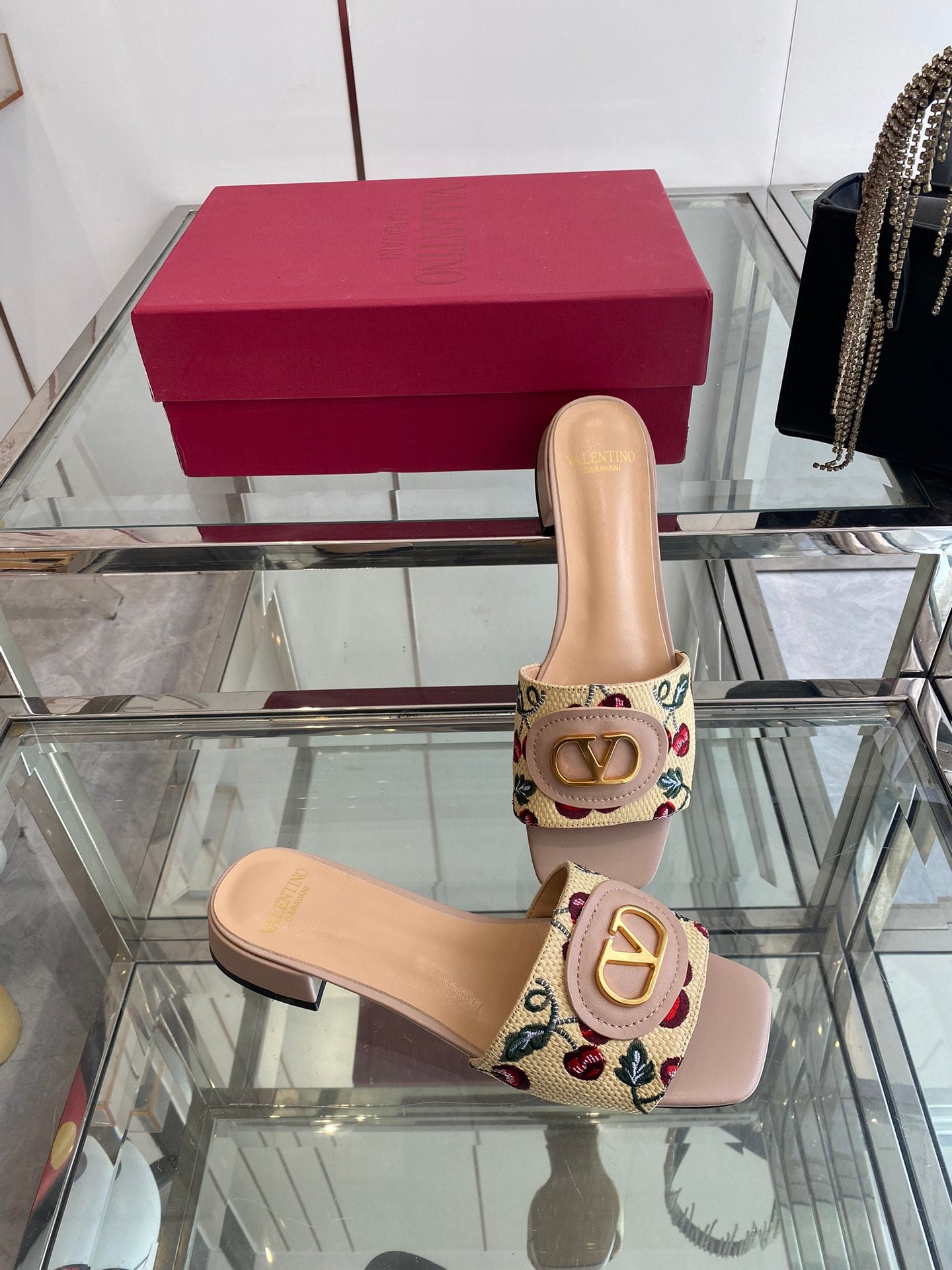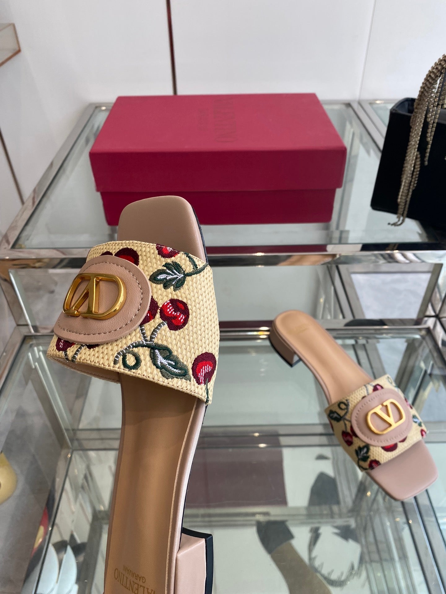 VLTN HIGH HEEL 25S 30 MM IN BEIGE FABRIC AND MUTED PINK LAMBSKIN WITH EMBROIDERED CHERRY MOTIF