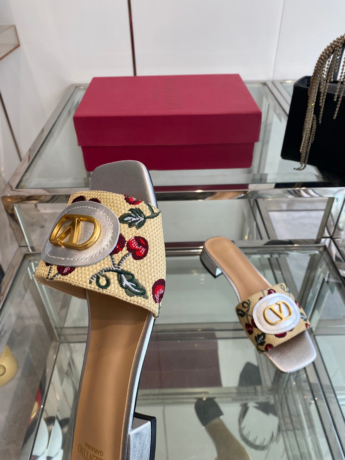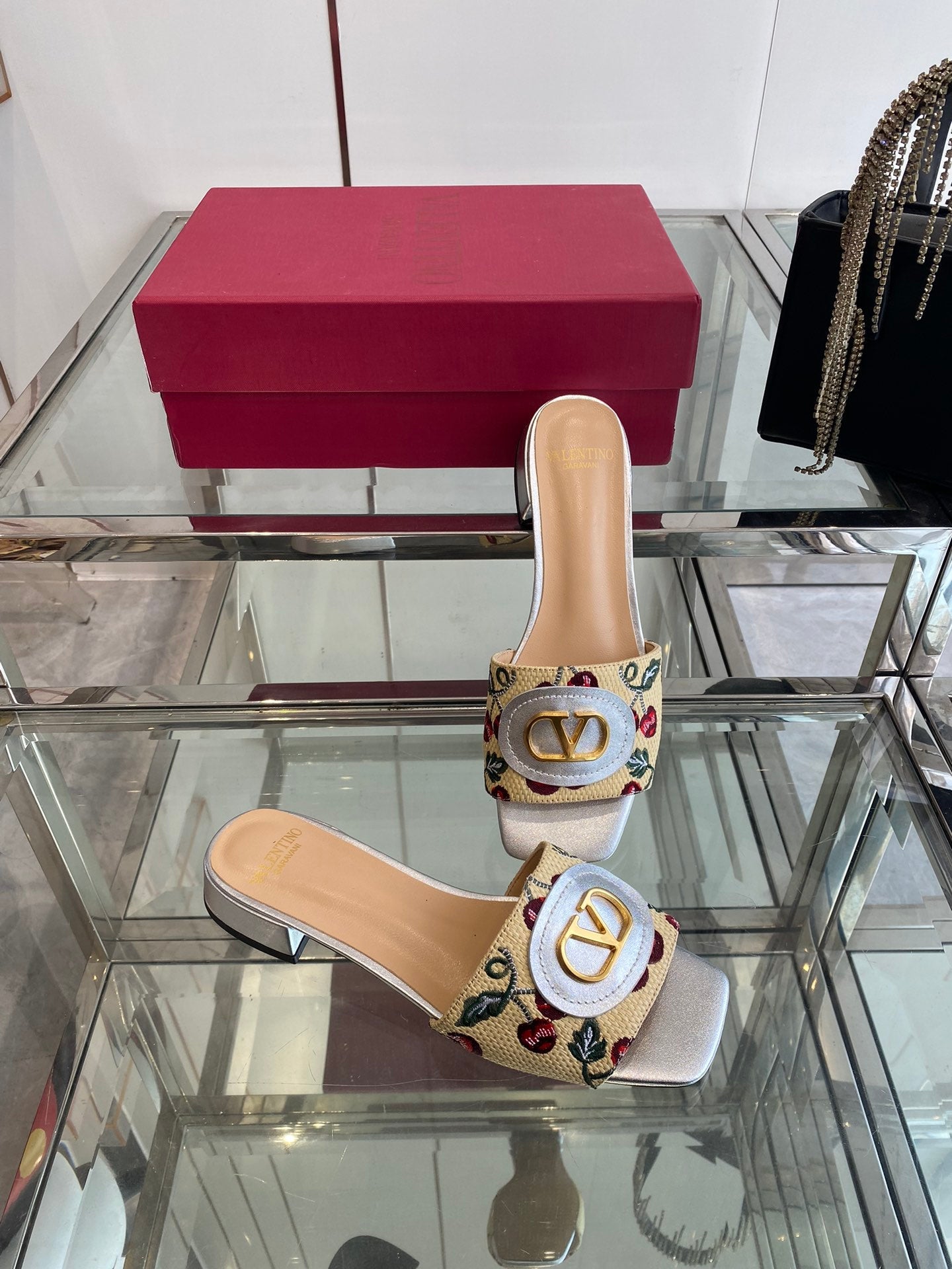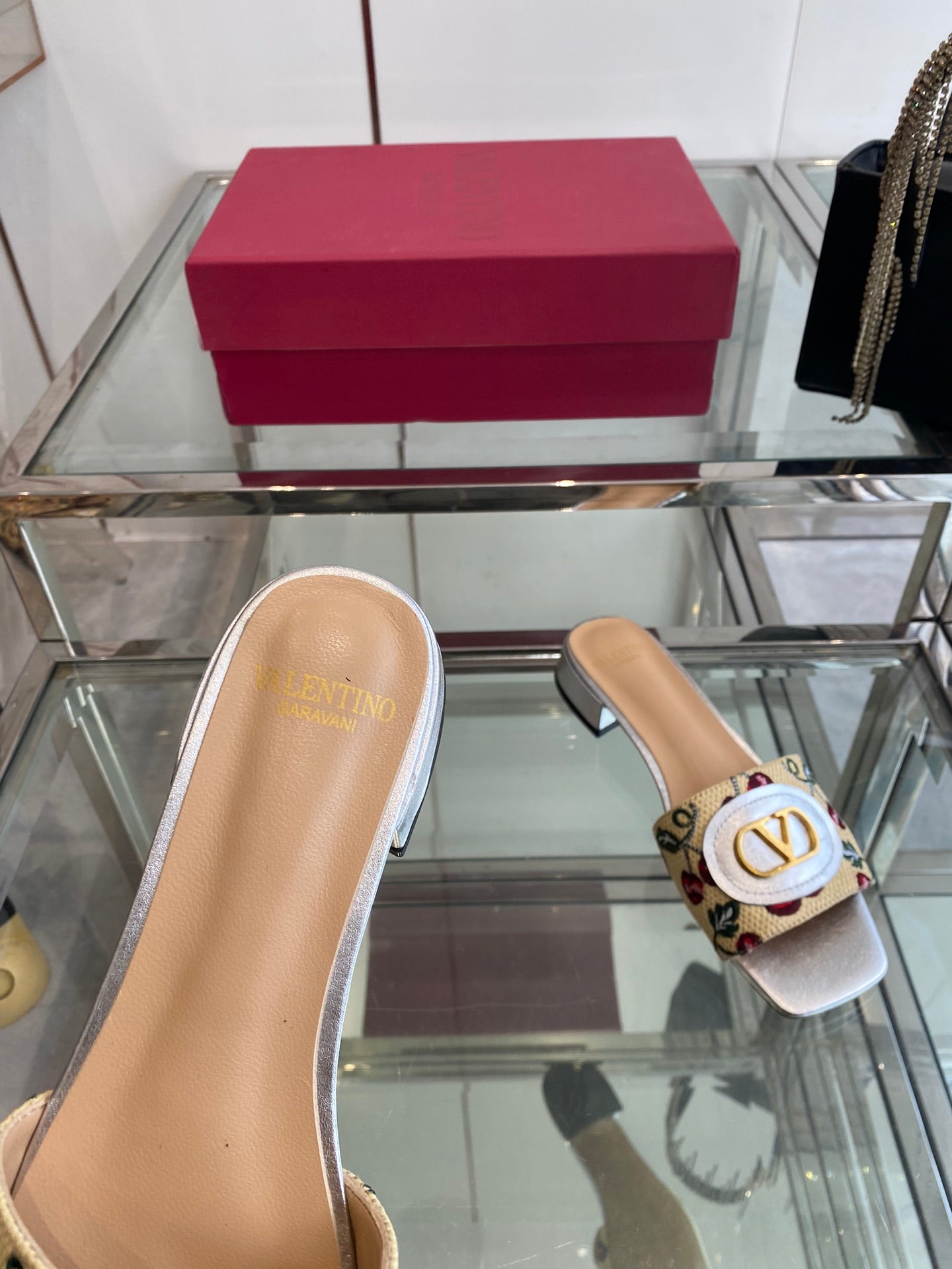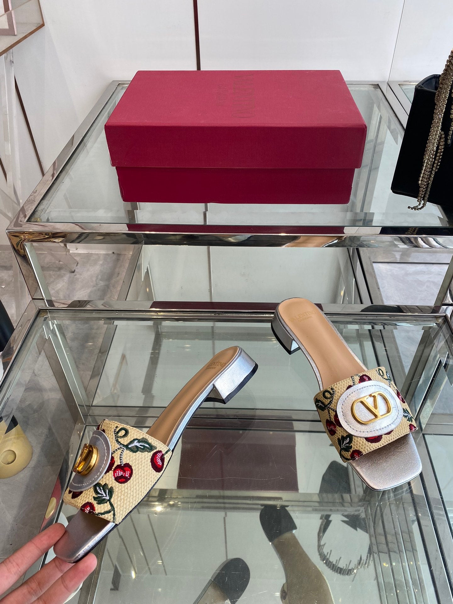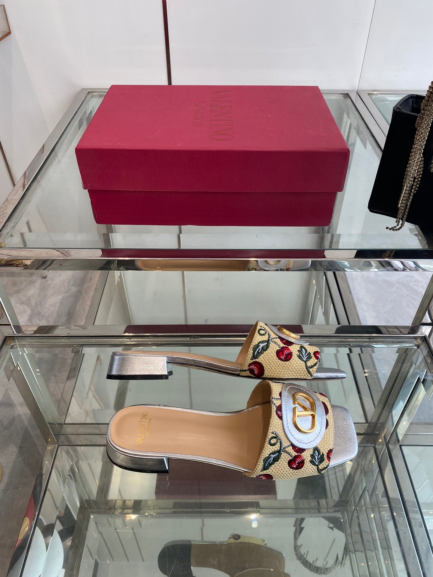 VLTN HIGH HEEL 25S 30 MM IN BEIGE FABRIC AND SILVER LAMBSKIN WITH EMBROIDERED CHERRY MOTIF
