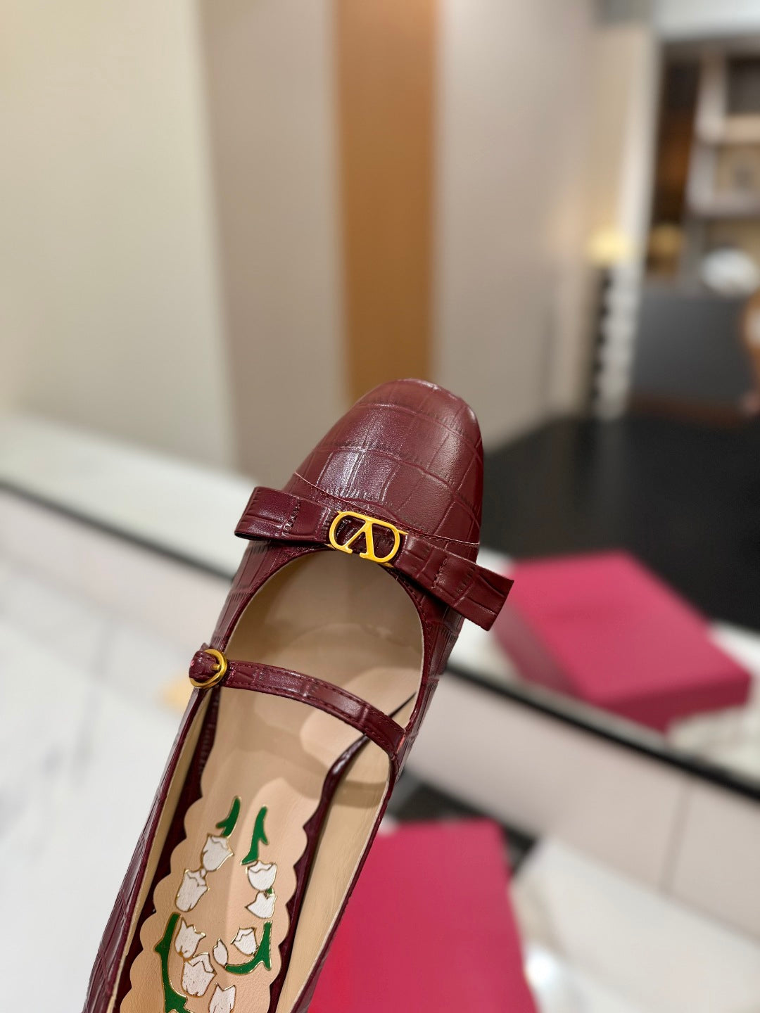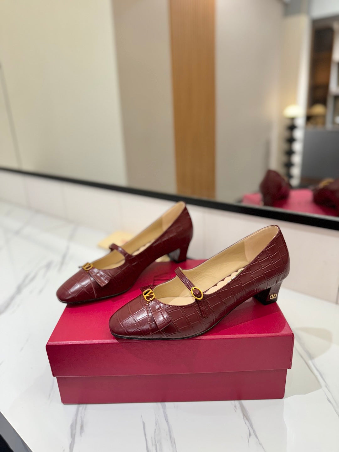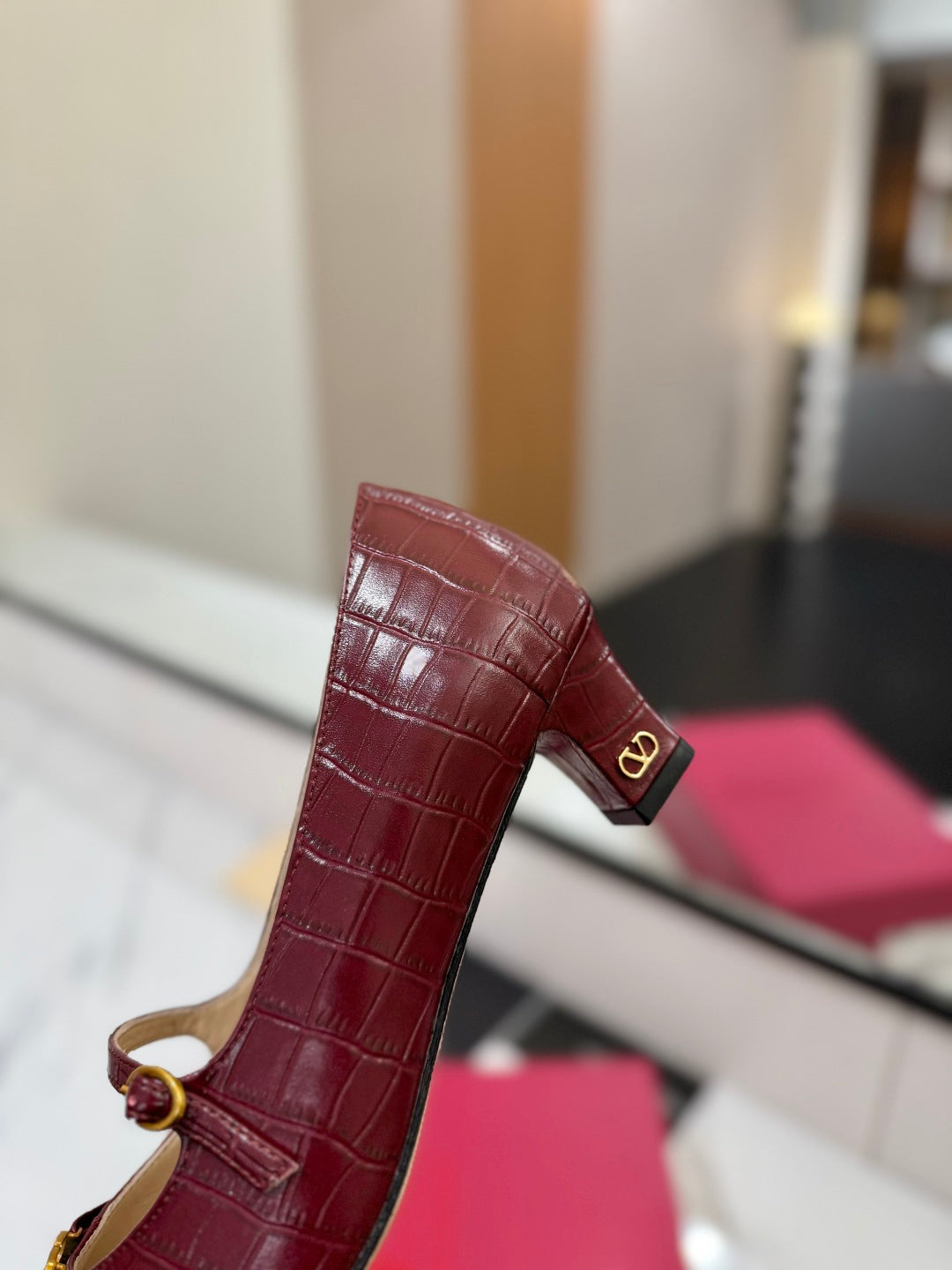 VLTN VLOGO SIGNATURE ROUND-TOE HEELS 25S IN DARK RED LAMBSKIN SNAKE-EMBOSSED
