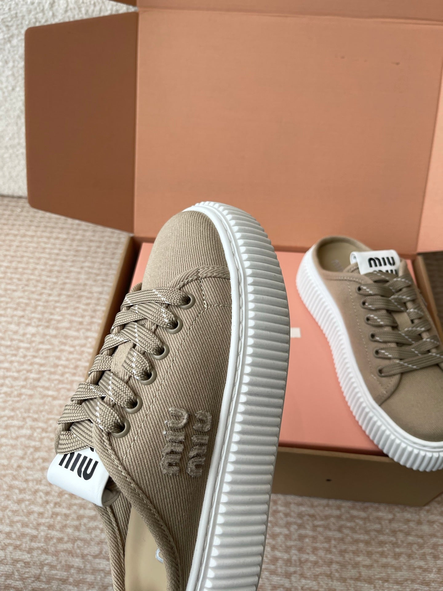 WASH SNEAKER MULES IN DARK BEIGE DENIM STRIPED LACES