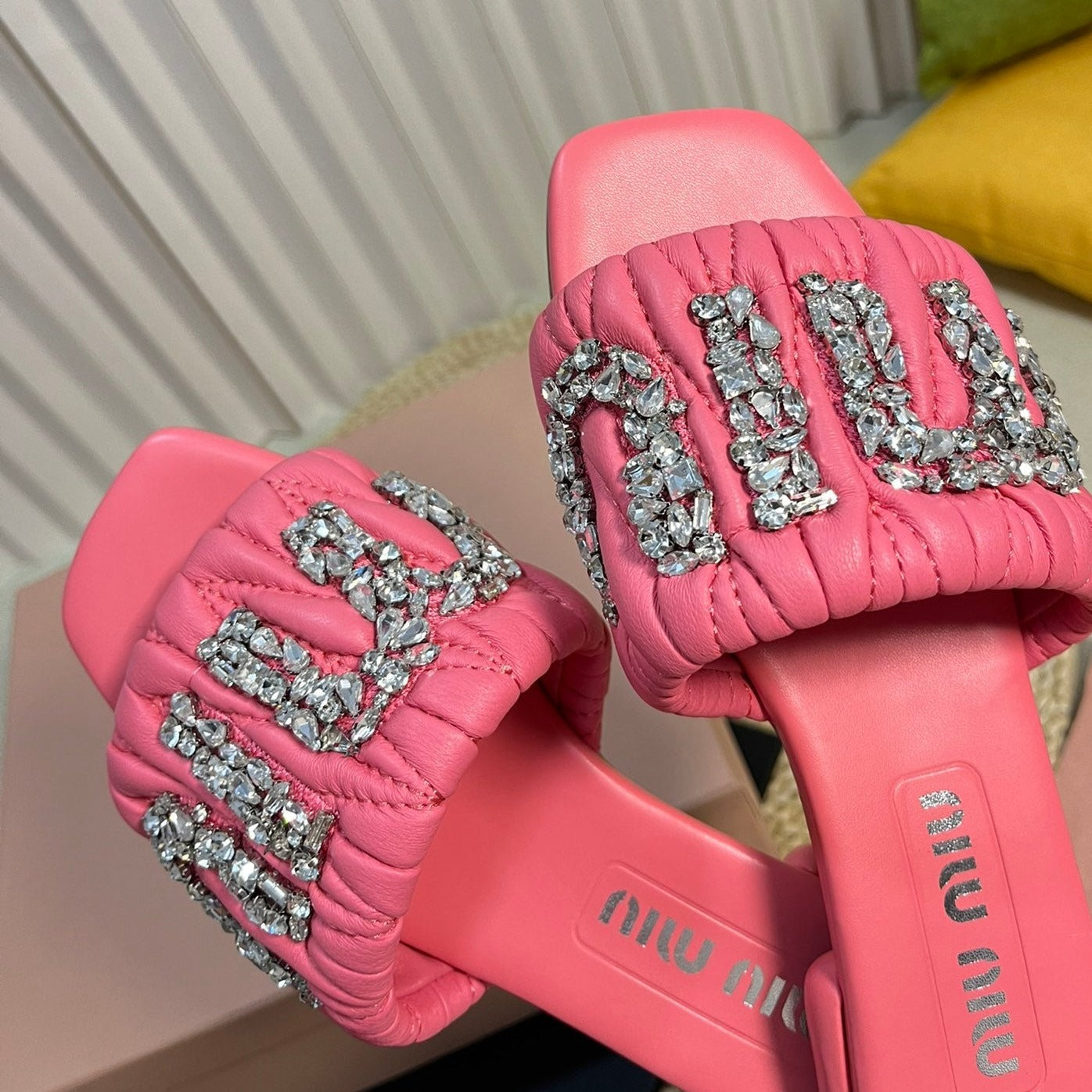 Women's Neon Pink Leather Diamond Slippers