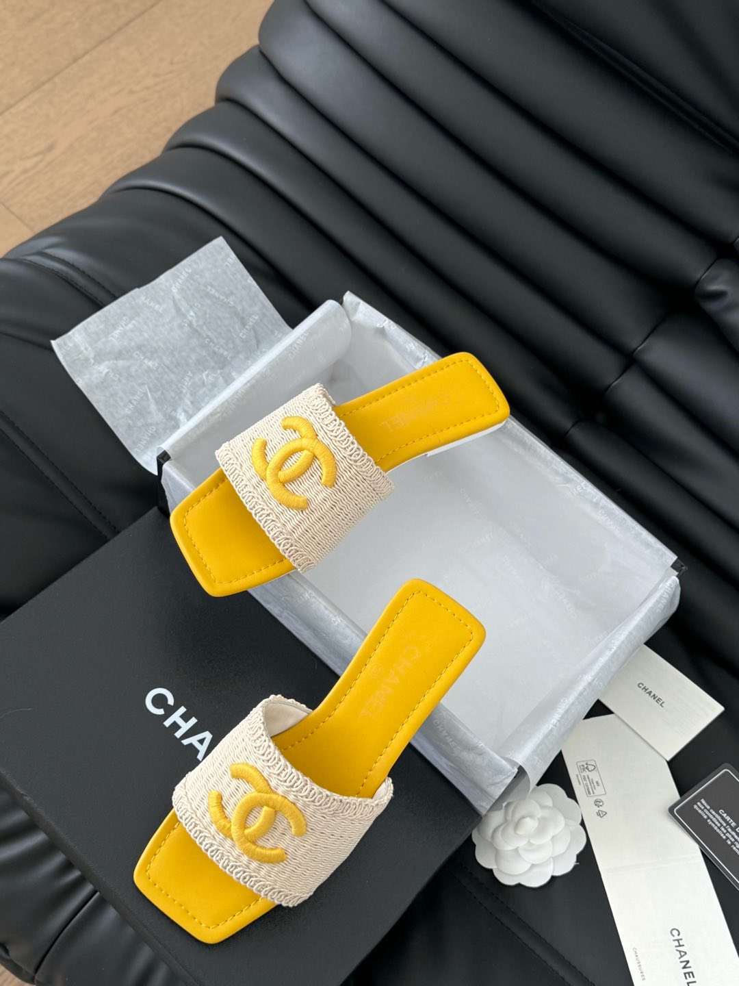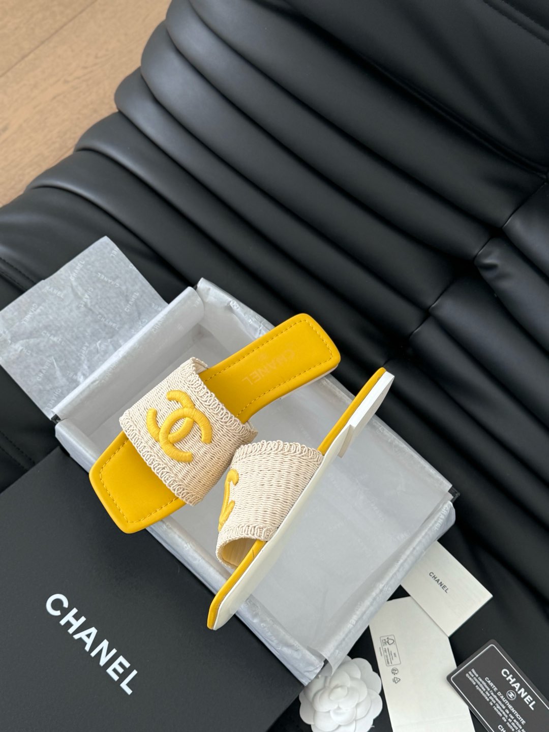 WOVEN SLIDE IN RAFFIA AND LIGHT YELLOW LAMBSKIN