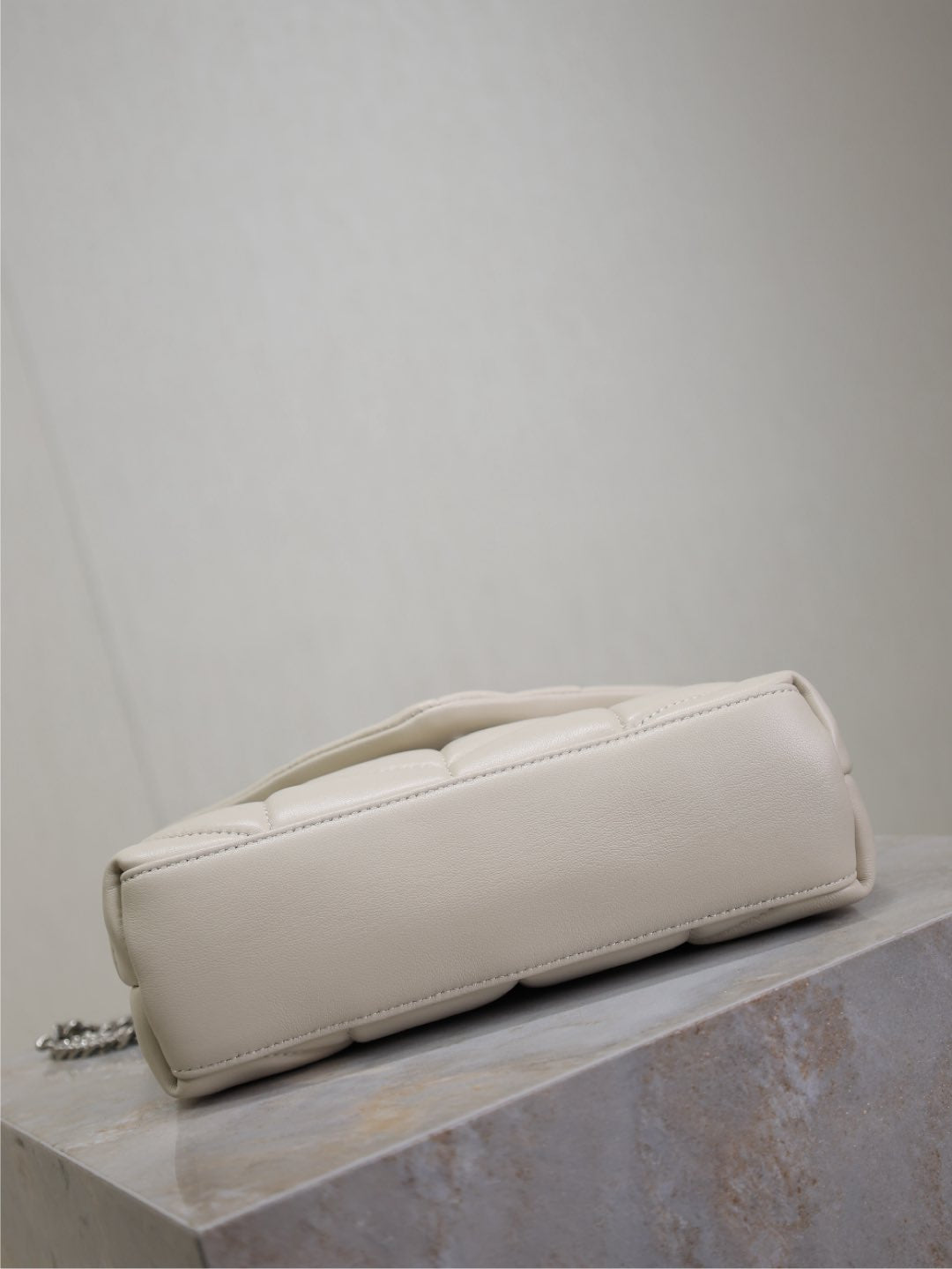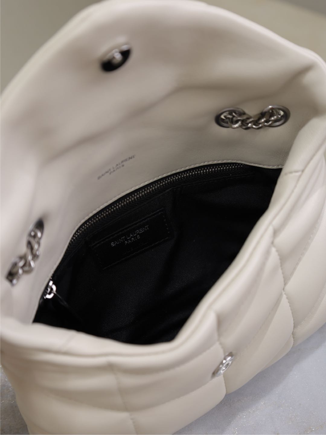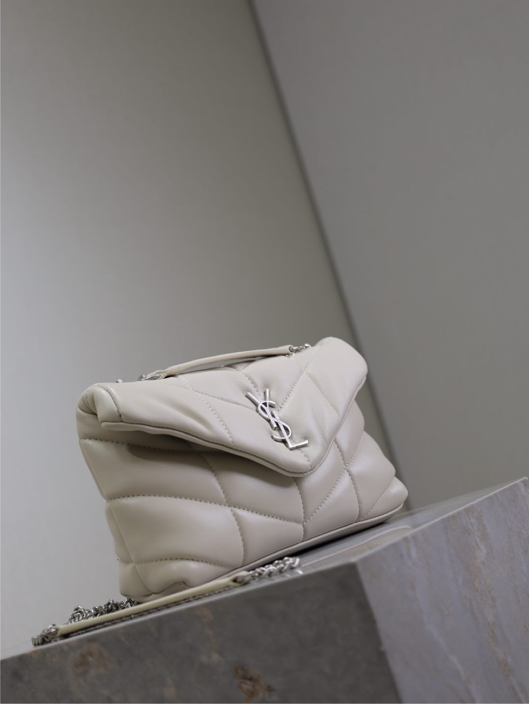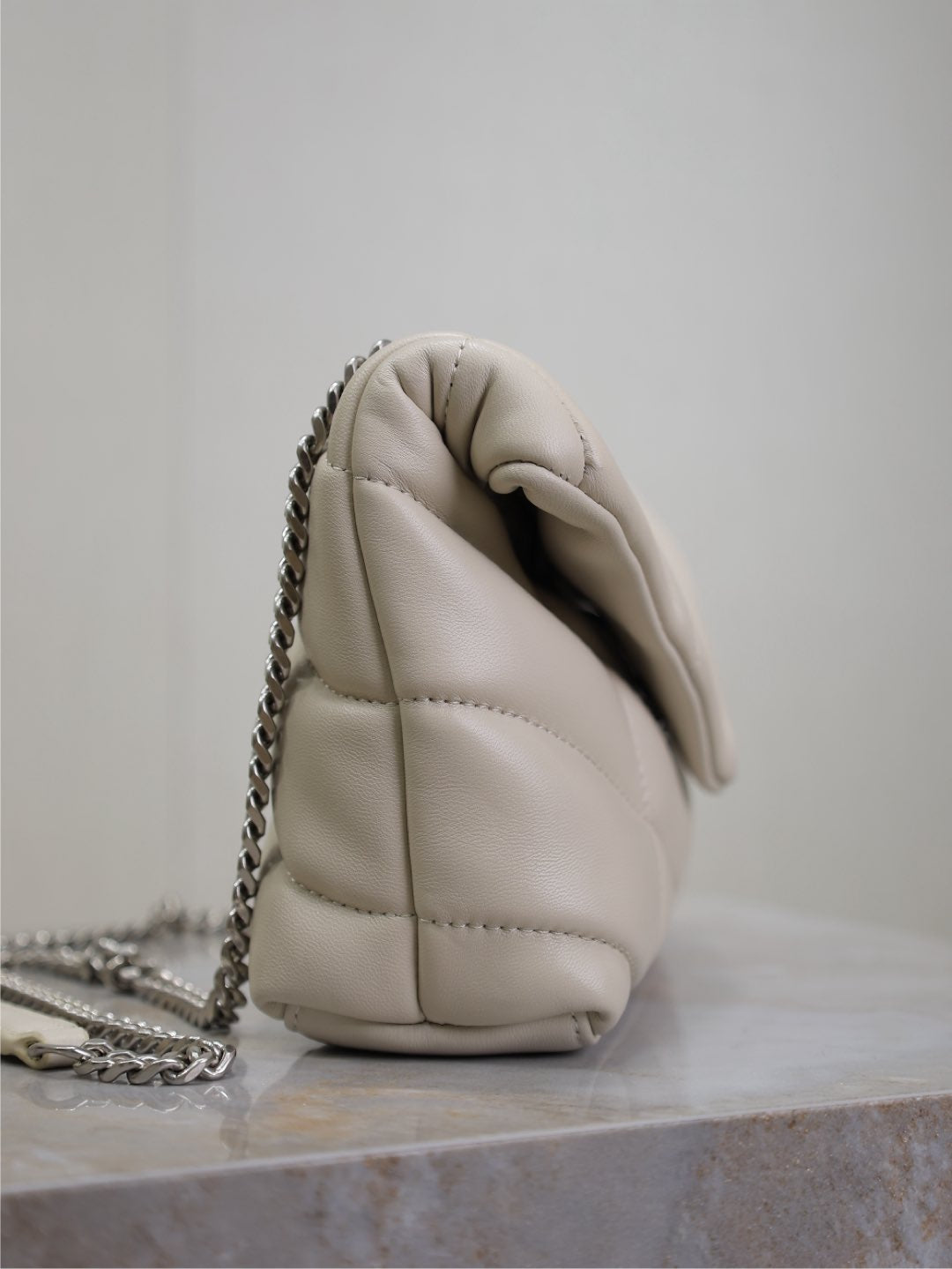 YSL 25S LOULOU PUFFER MINI 23 IN SMOKEY TAUPE CALFSKIN SILVER HARDWRE
