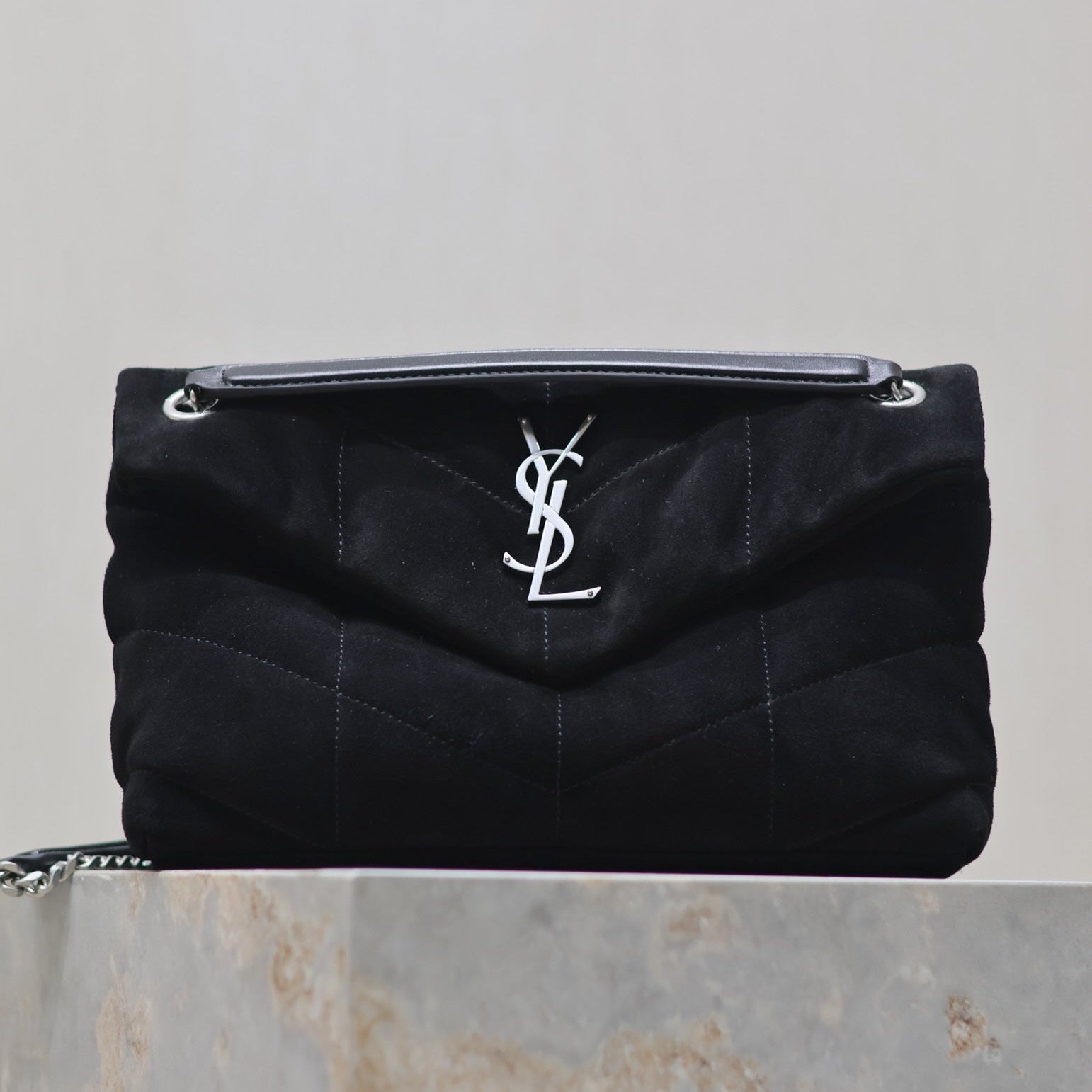 YSL 25S LOULOU PUFFER MM 29 IN BLACK SUEDE SILVER HARDWRE