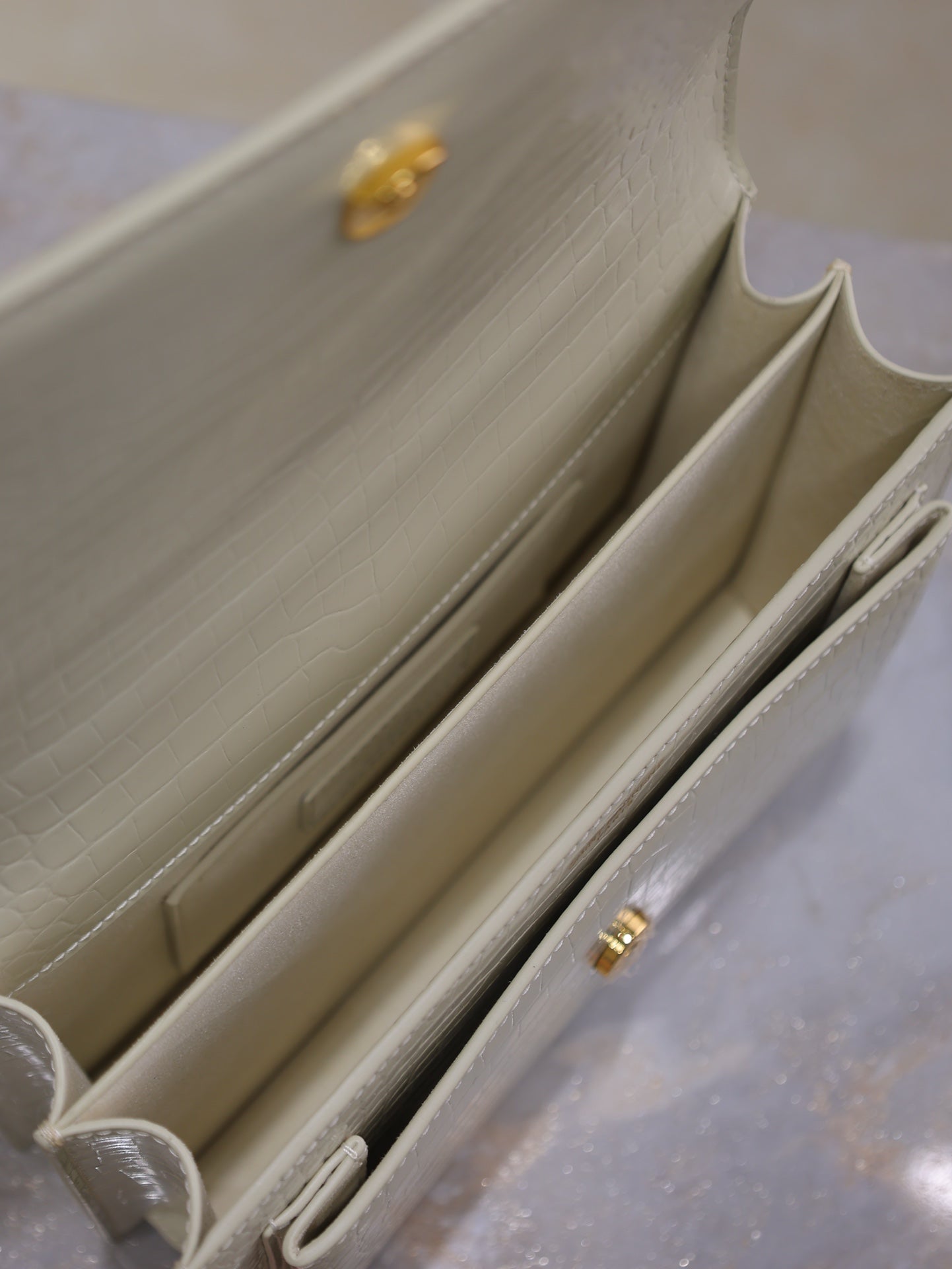 YSL 25S SUNSET MEDIUM 22 IN IVORY CROCODILE-EMBOSSED SHINY CALFSKIN GOLD HARDWRE